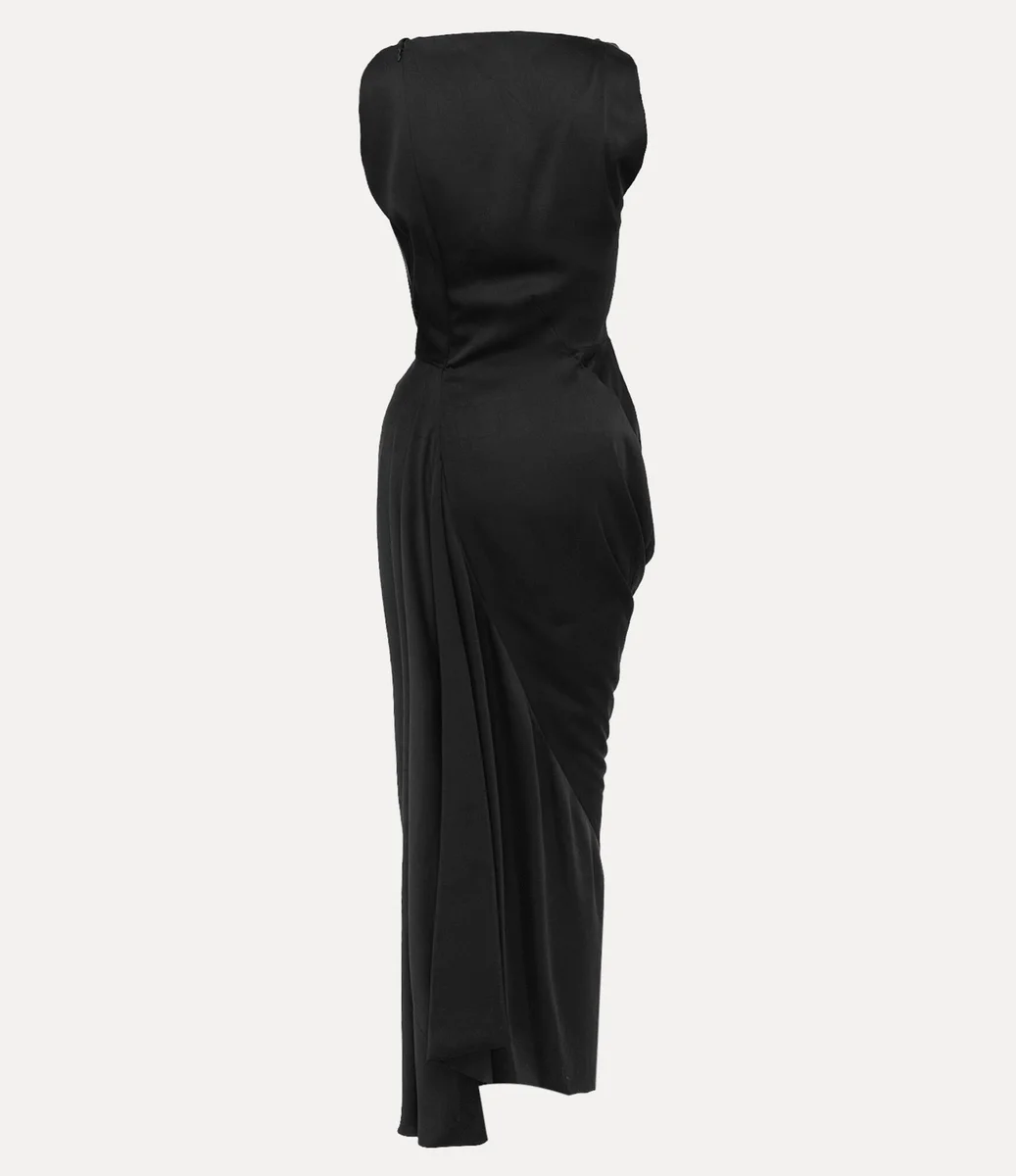 L’abito lungo Fond presenta un elegante drappeggio sul collo e in vita, che scende in una silhouette a colonna allungata con orlo asimmetrico. Impreziosito da un ulteriore drappeggio sul retro, il capo si chiude con una cerniera laterale nascosta per una finitura liscia.