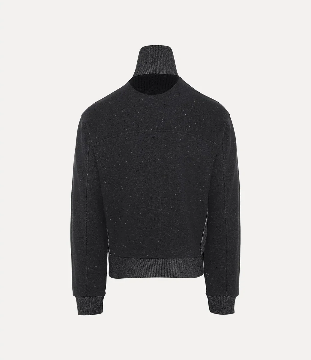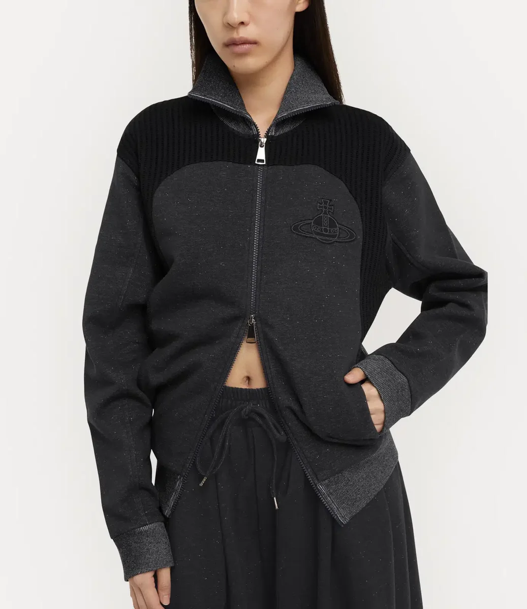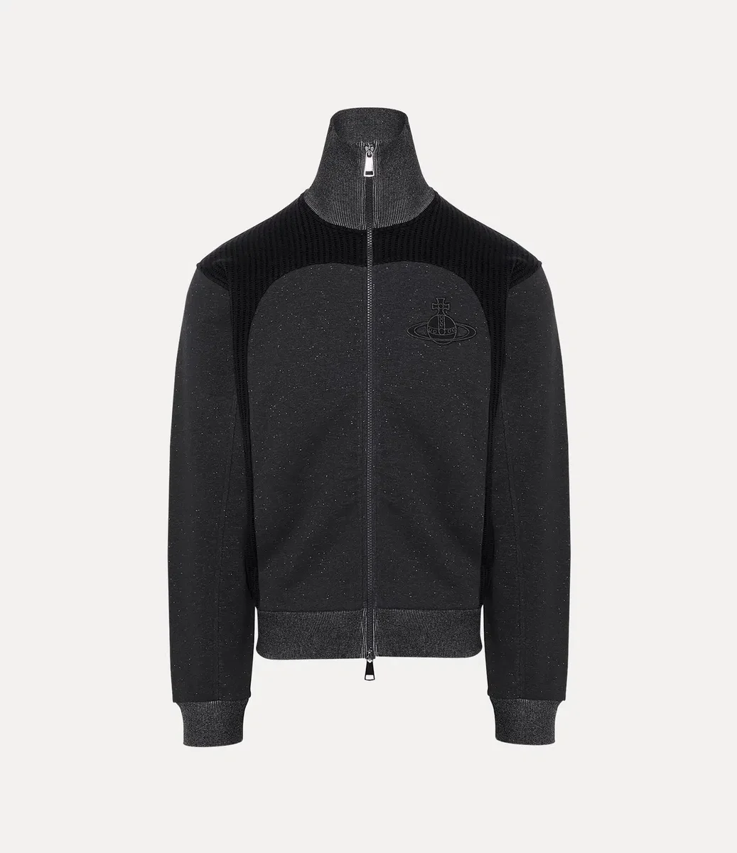 La giacca Alien Track di questa stagione reintroduce la chiusura con zip a doppio cursore, un dettaglio utilizzato per la prima volta da Vivienne Westwood tra la fine degli anni ’70 e l’inizio degli anni ’80 come simbolo di anticonformismo e segno distintivo della sua estetica punk ribelle. Caratterizzata da un collo alto e da pannelli a costine su tutta la superficie, la giacca è rifinita con il motivo Graffiti orb della maison, ricamato con discrezione sul petto con filo tono su tono.
