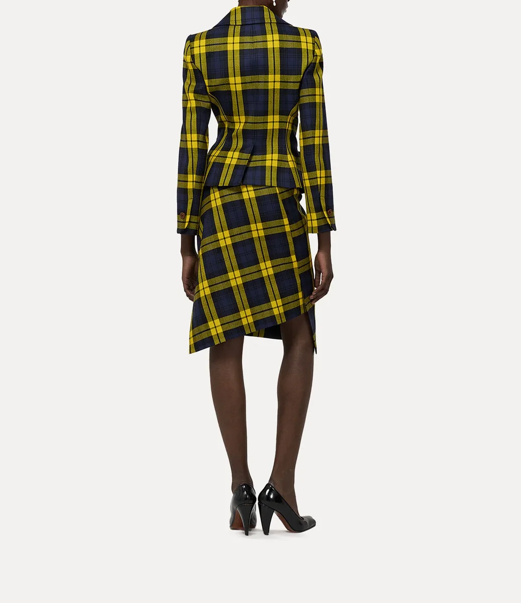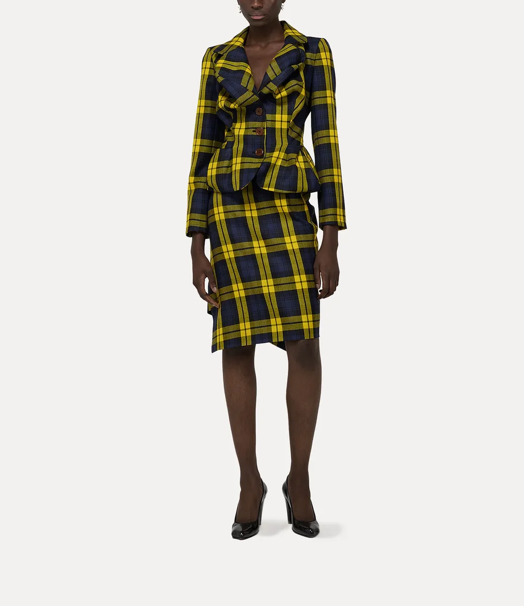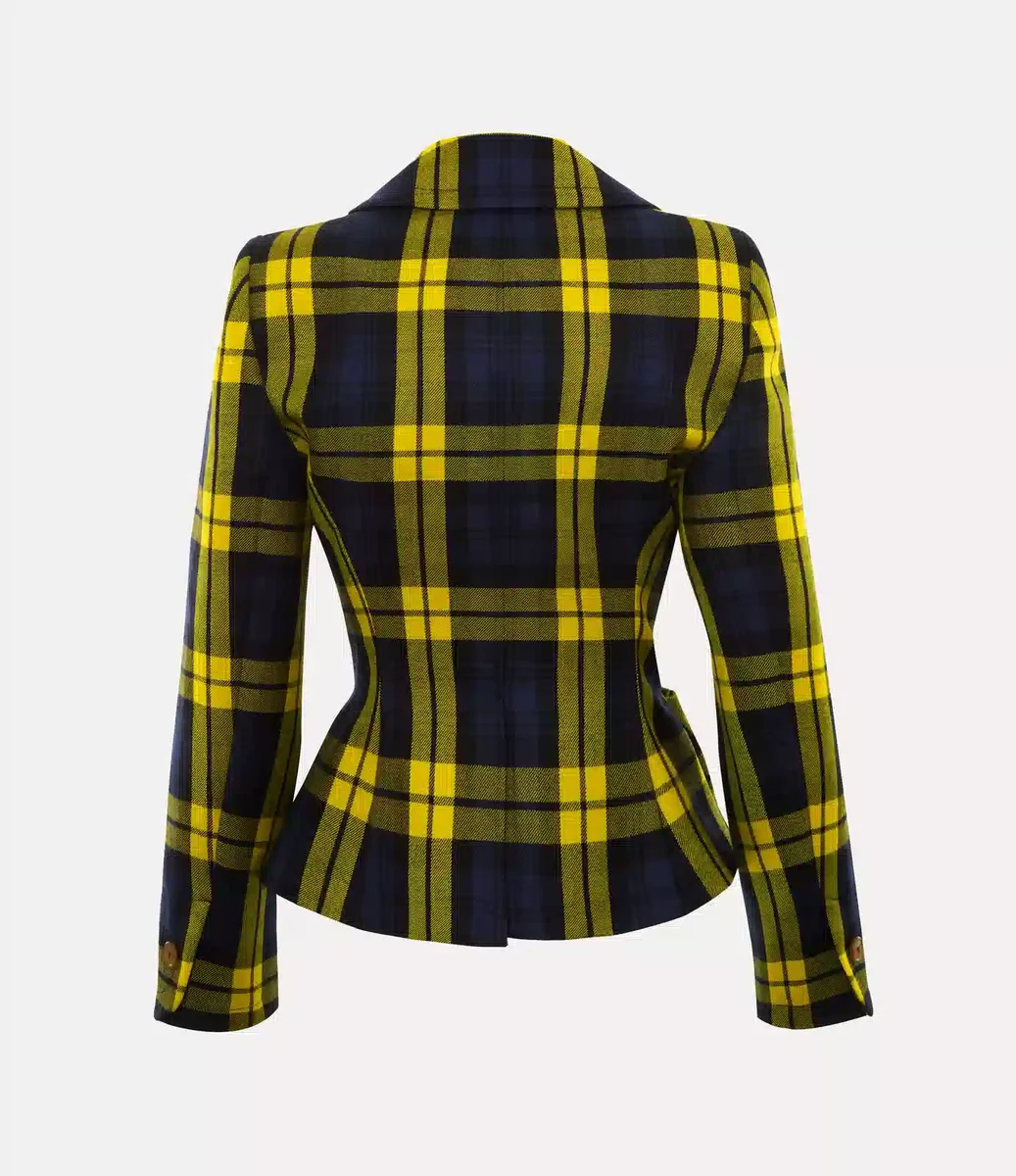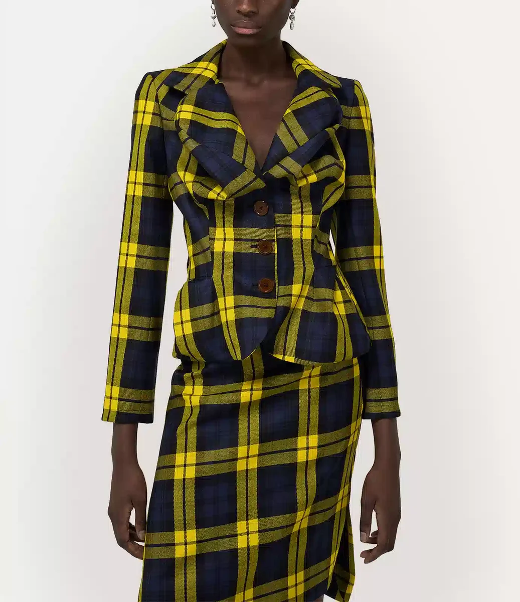 La giacca Drunken utilizza l’originale sistema di taglio sartoriale sperimentale di Vivienne, in cui gli elementi del capo sono distorti assumendo una forma quasi surreale. Il capo presenta il tartan di lana “Moonshine” di questa stagione, con tonalità vivaci e un design con bottoni sul davanti.