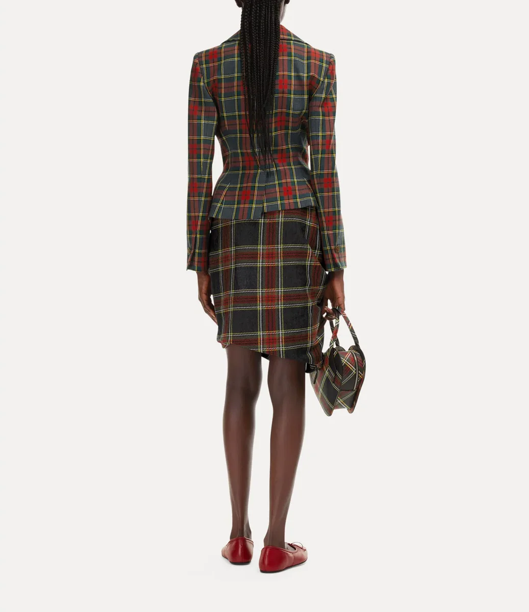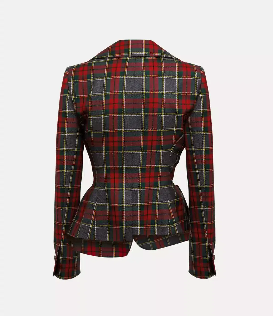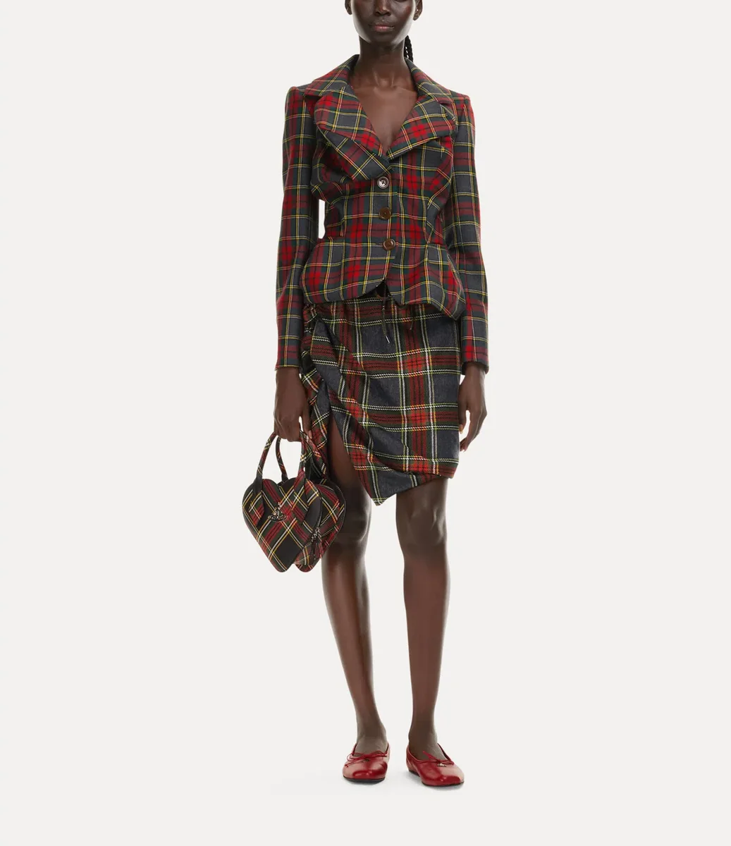 La nostra giacca Drunken utilizza l’originale sistema di taglio sartoriale sperimentale di Vivienne, in cui gli elementi dell’indumento vengono distorti assumendo una forma quasi surreale. Il capo è proposto nella vivace tartan “Scarlet” di questa stagione, rifinito con chiusura frontale con bottoni.