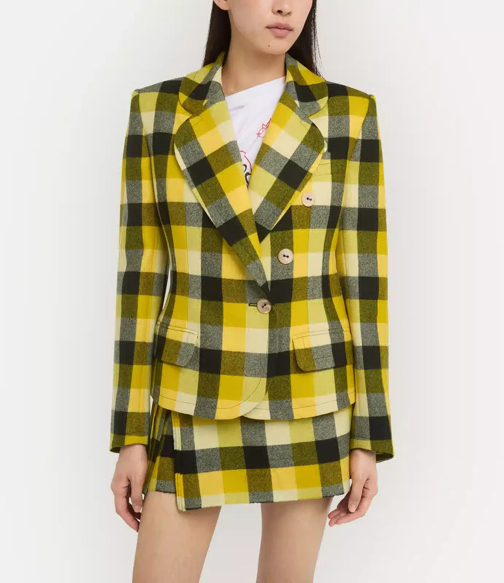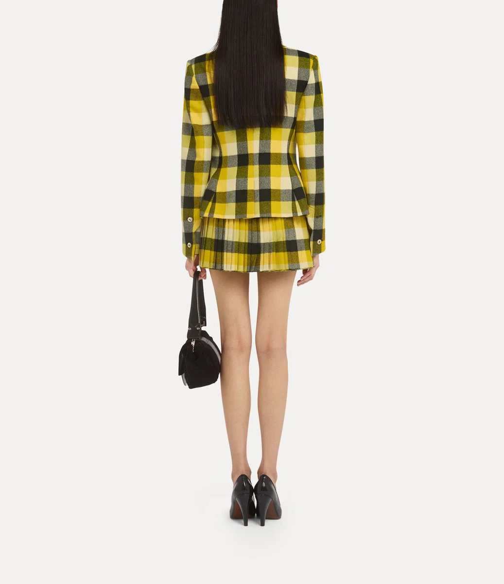 La giacca Georgia di Vivienne Westwood, realizzata in lana, presenta il motivo a quadri “Pixel” di questa stagione e si chiude con un bottone in madreperla.