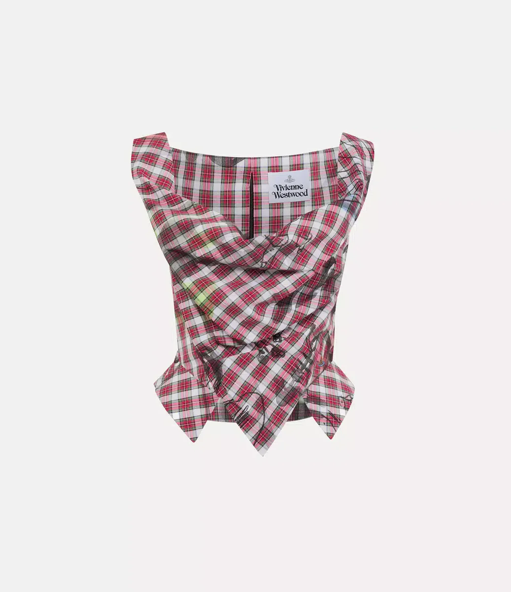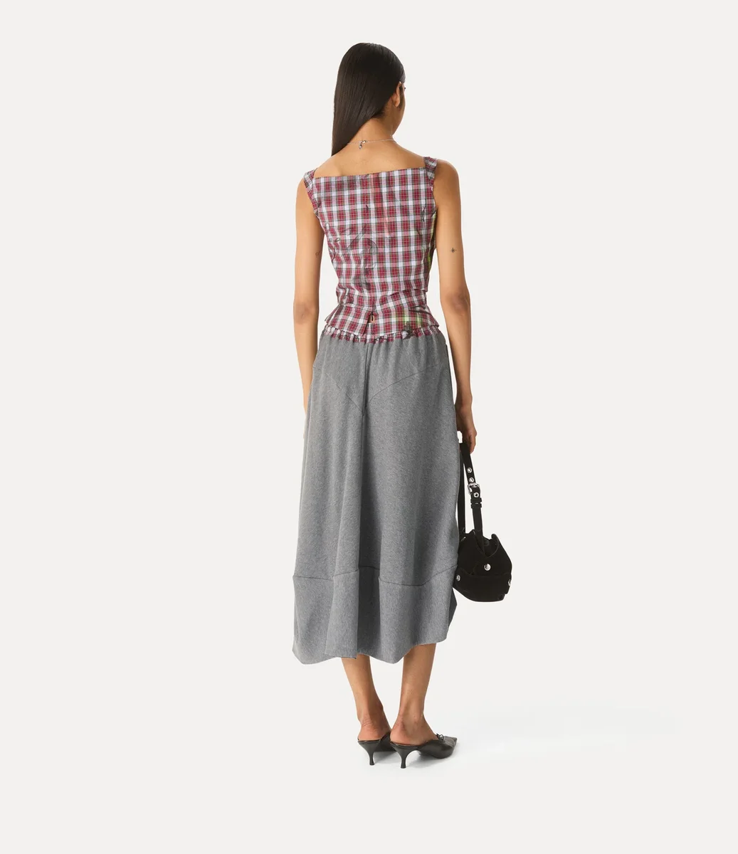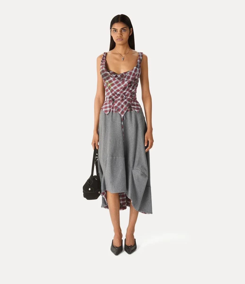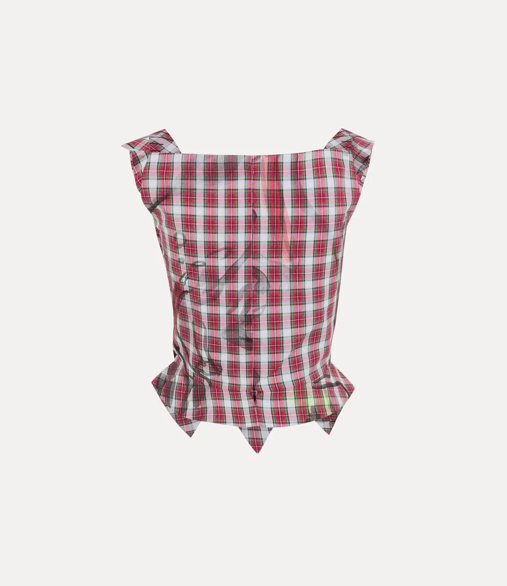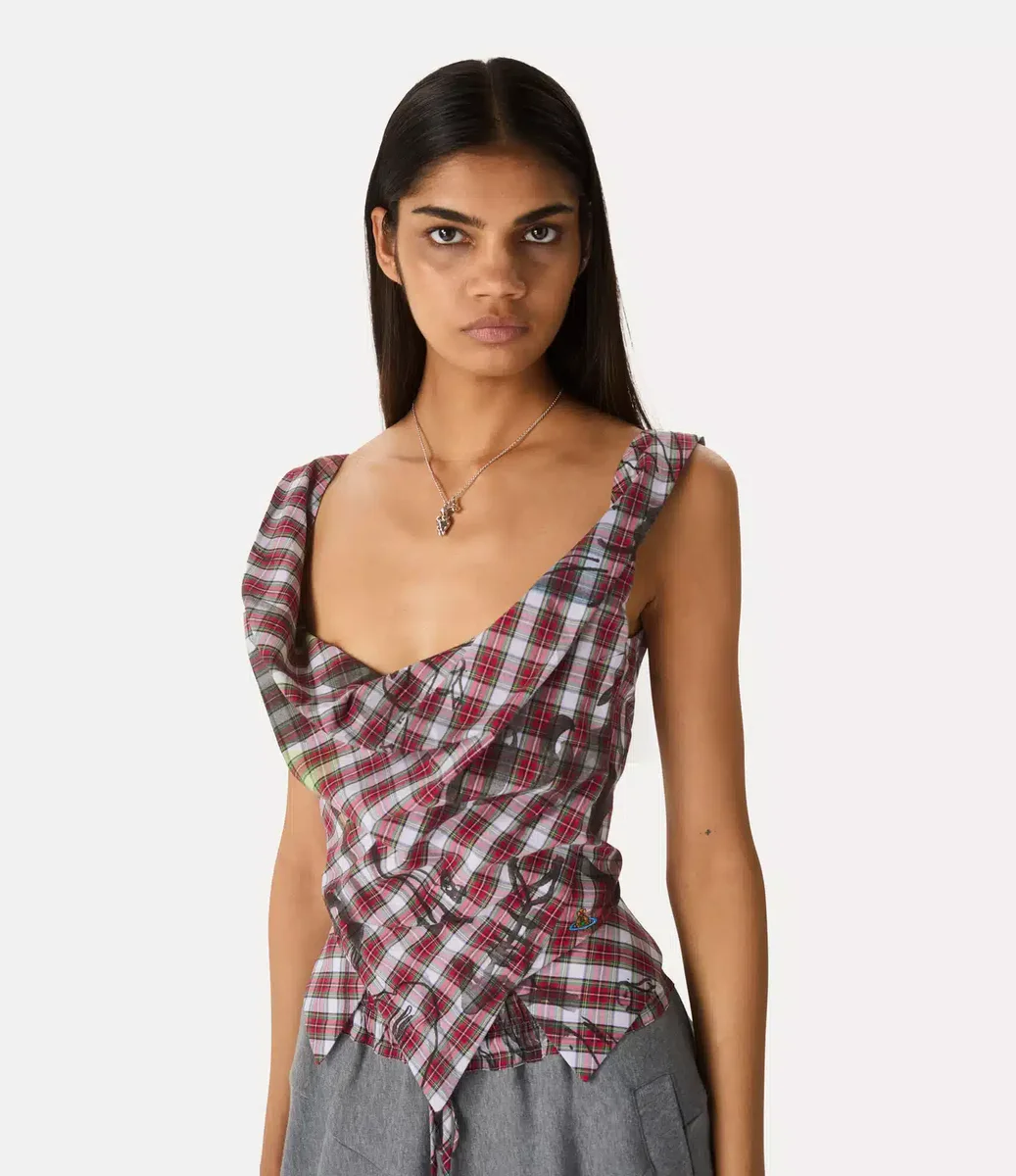 In questa stagione, il nostro top Sunday è realizzato con un motivo a quadri tartan rosso stampato, che evoca un’estetica classica e artigianale. Sovrapposto alle illustrazioni stampate disegnate a mano da Dominic Myatt e accentuato da vivaci graffiti spray, il design rende omaggio allo spirito punk “fai da te” della maison.