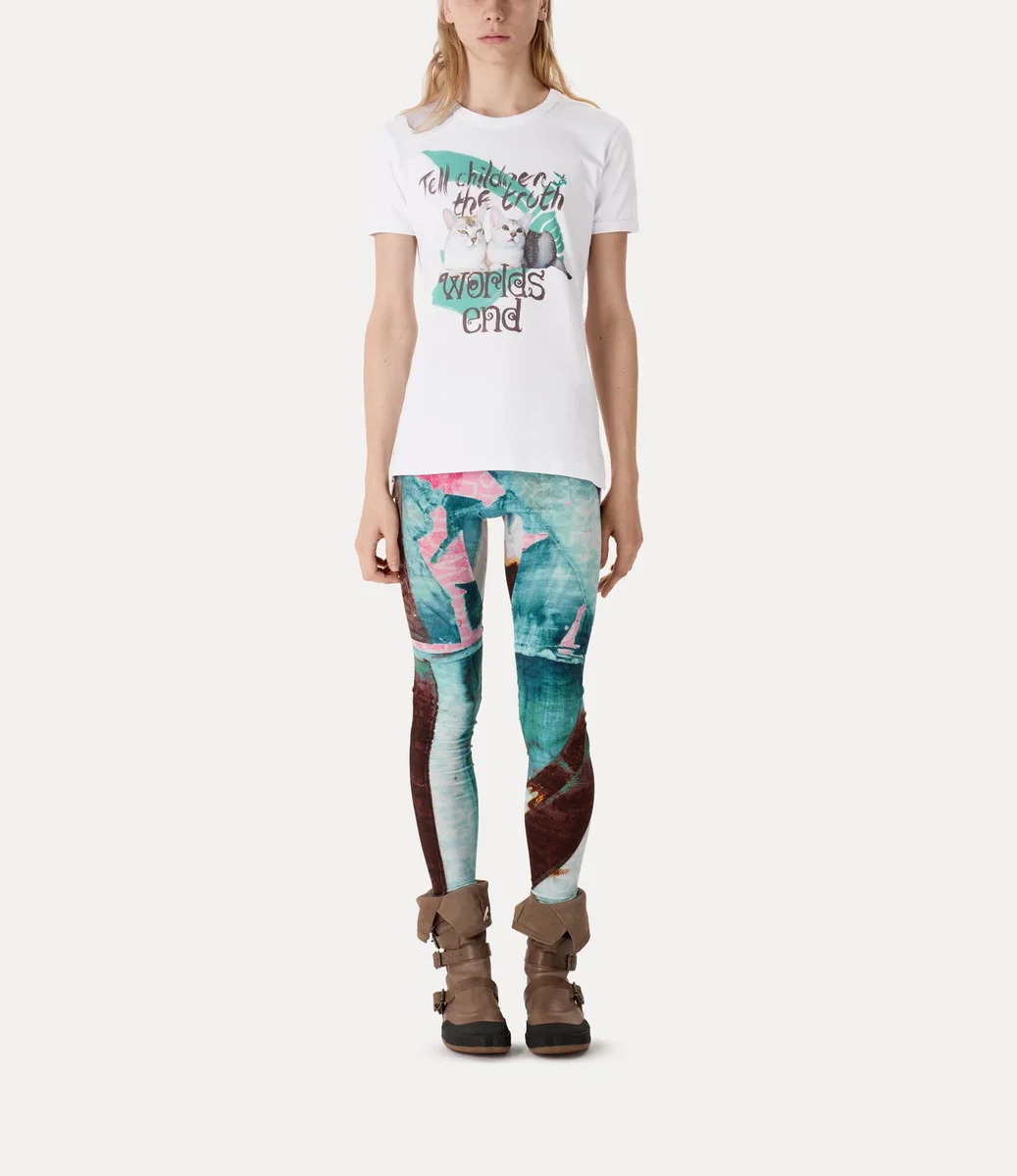 La nostra t-shirt Worlds End Classic è realizzata in morbido cotone e presenta maniche corte con un classico scollo rotondo. La parte anteriore mostra l’opera d’arte d’archivio “Cats” insieme allo slogan “Tell the children the truth” (Dite la verità ai bambini), che affronta l’indifferenza della società nei confronti delle crisi ambientali e il legame tra il commercio di armi e la crisi climatica.