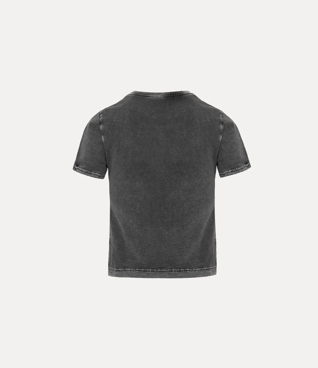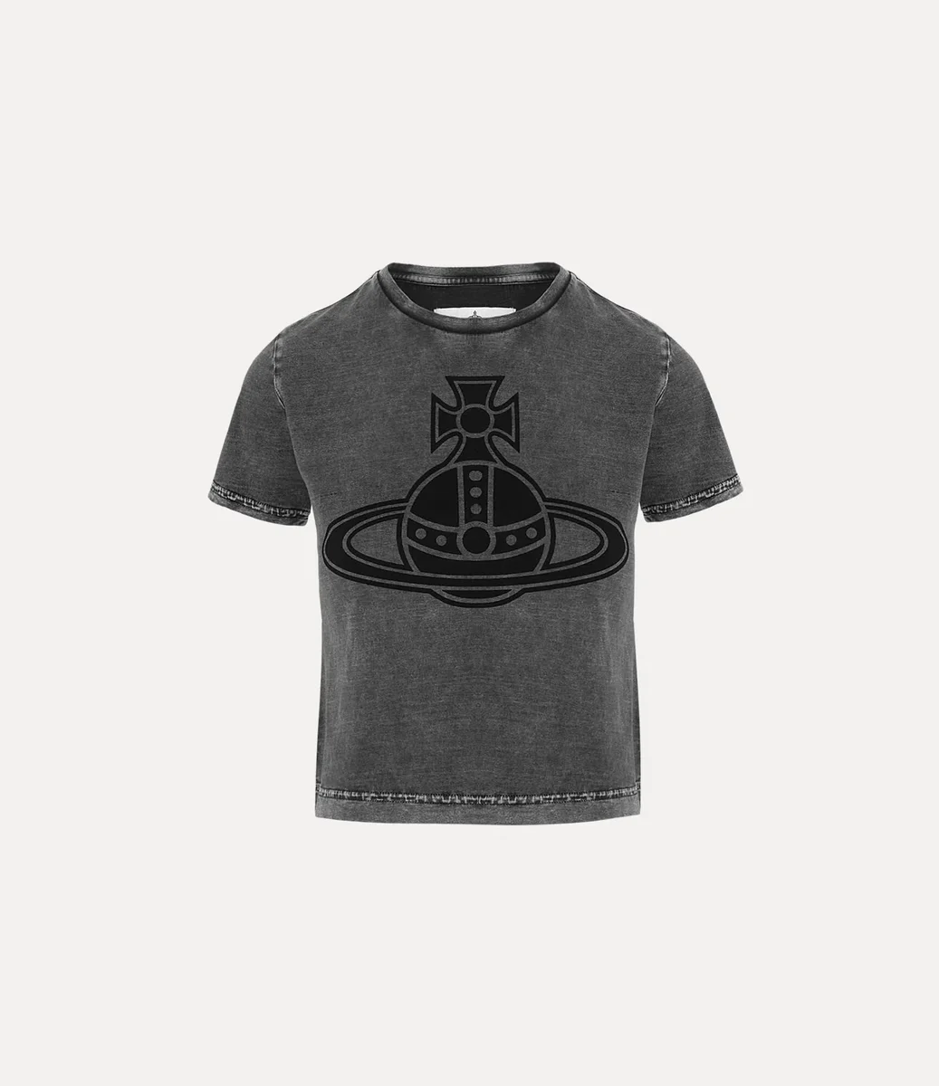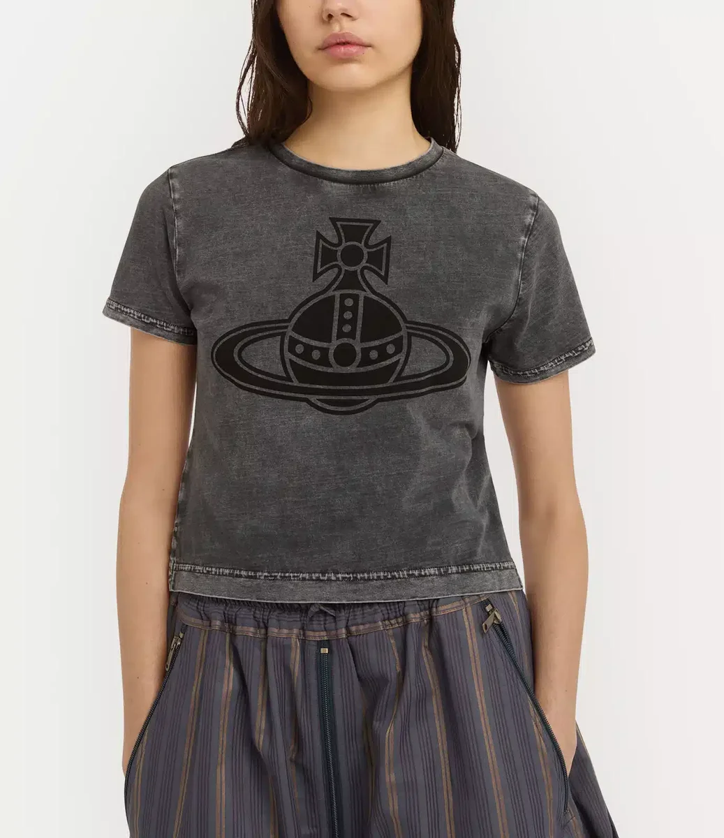 La nostra T-shirt Paris Orb Mini Peru è realizzata in jersey di cotone leggero, con silhouette corta, classico girocollo e orlo asimmetrico a gradini. Impreziosita dal motivo orb della maison, questo capo riflette la visione di Vivienne di proiettare la tradizione nel futuro.