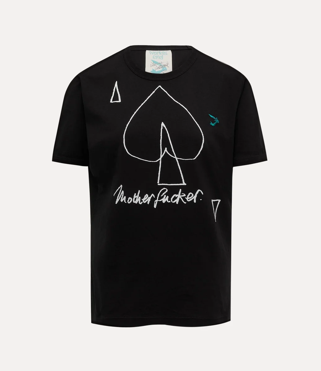 La nostra t-shirt Worlds End Classic è realizzata in morbido cotone, con maniche corte e scollo rotondo. Il capo è impreziosito dal ricamo d’archivio “Arm and Cutlass” sul petto e dalla grafica “Motherfucker” della maison, presentata per la prima volta nella sfilata Vivienne Westwood Primavera-Estate 2018 “We Are Motherfucker”, che sottolinea l’urgente necessità di proteggere il nostro pianeta, Madre Terra.