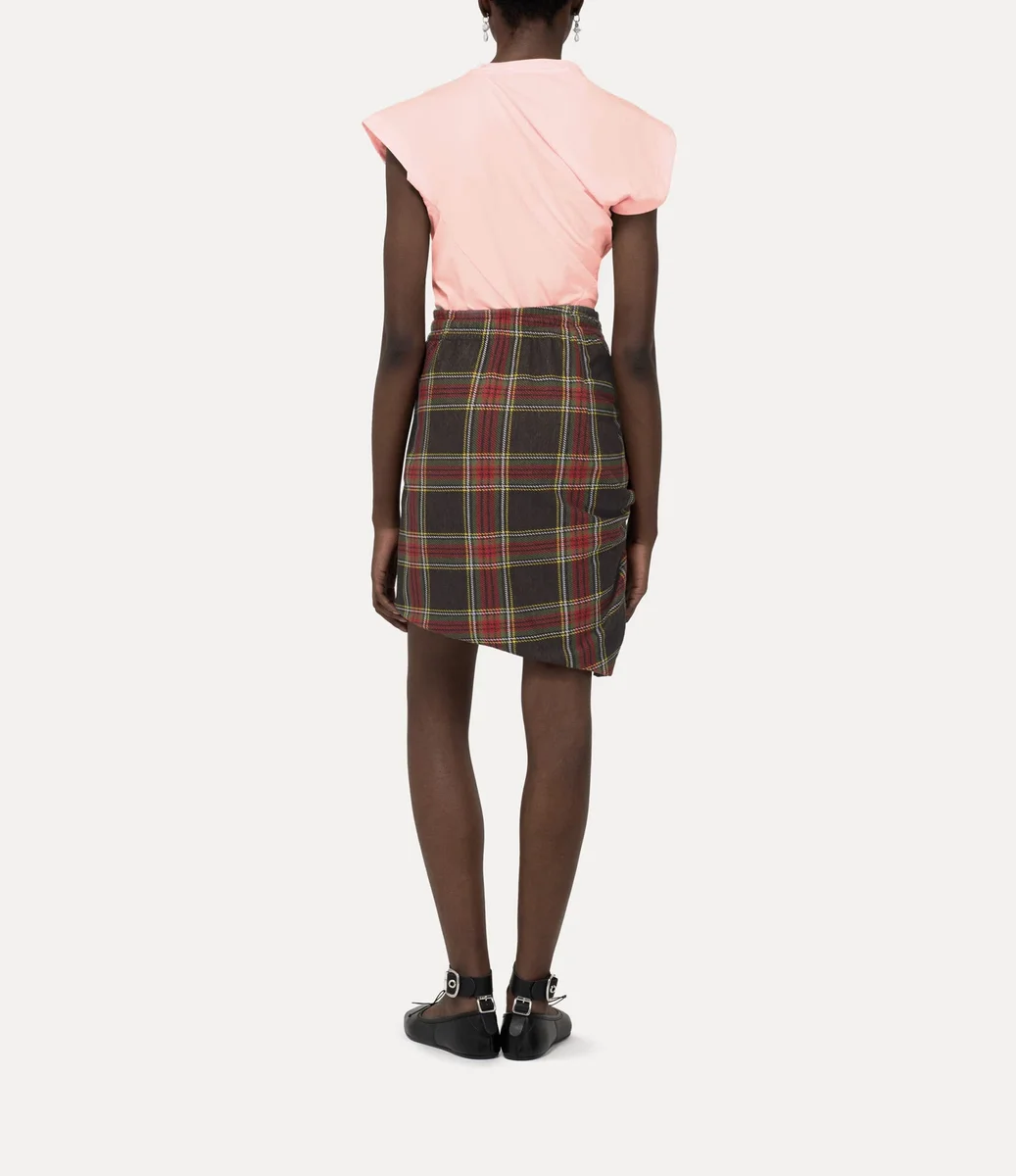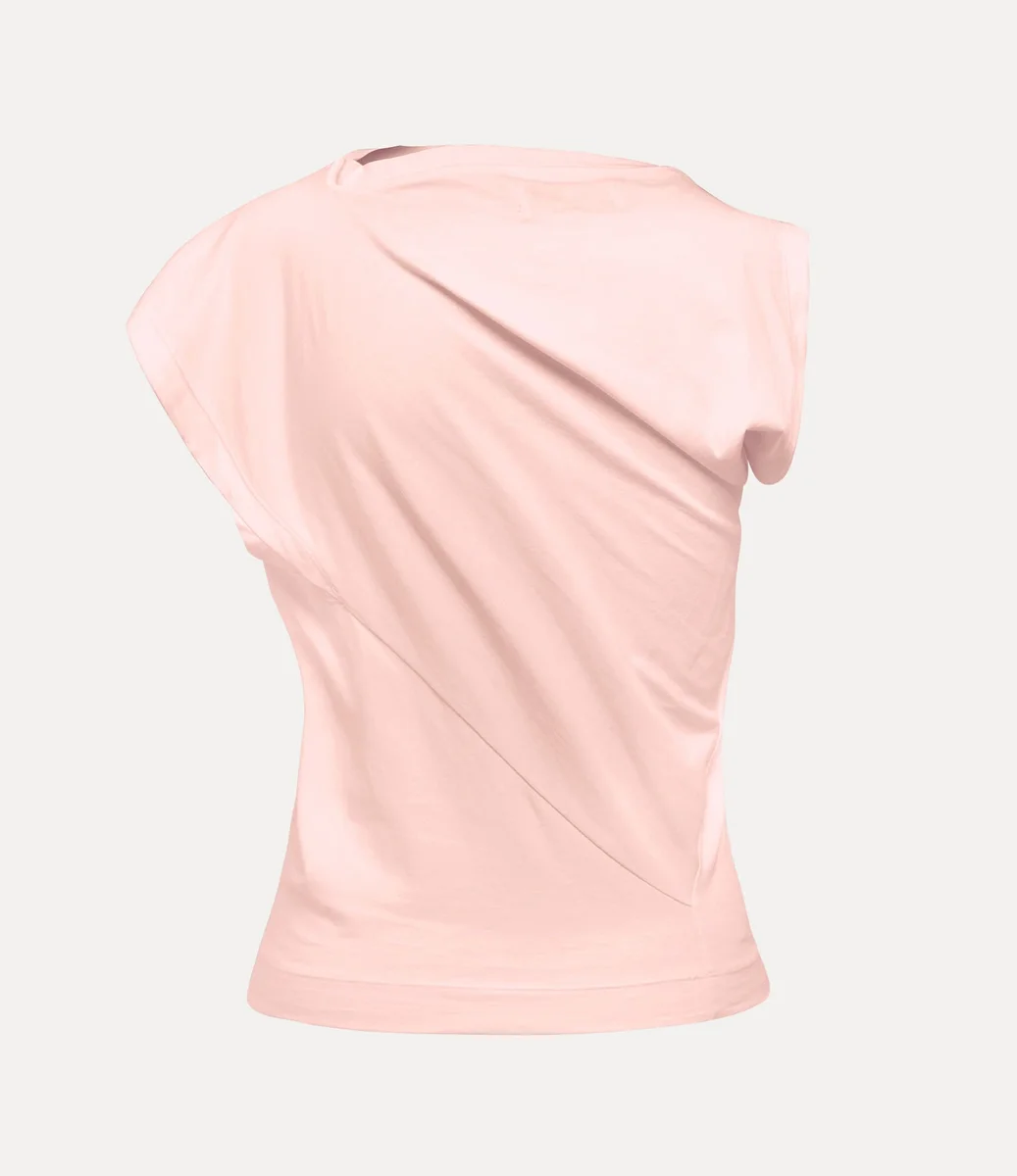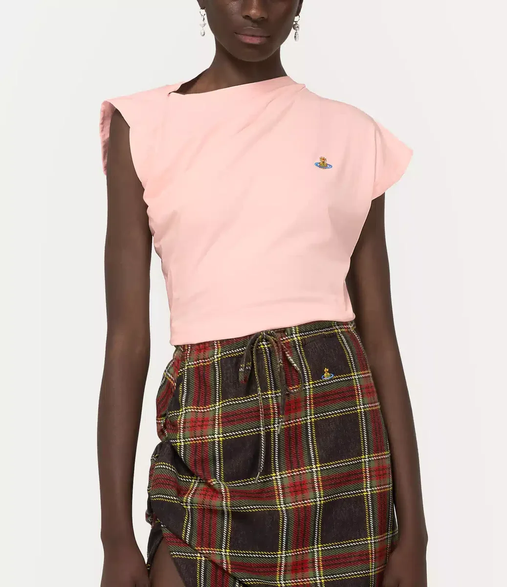 Il top Hebo, capo iconico della maison, è stato rinnovato e presenta in questa stagione una morbida finitura in cotone e un ricamo a forma di globo sul lato sinistro del petto, sinonimo della visione di Vivienne di proiettare la tradizione nel futuro. La silhouette incorpora la scollatura ispirata al taglio obliquo, i dettagli drappeggiati e il tessuto intrecciato sul retro, tutti elementi distintivi di Vivienne.