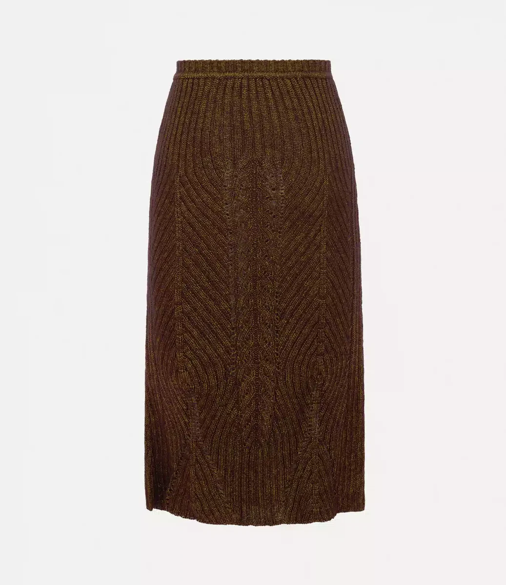 La gonna Mary di Vivienne Westwood è realizzata in misto seta e mohair e presenta un mix di punti a spina di pesce e a coste, completato da una silhouette ad A.