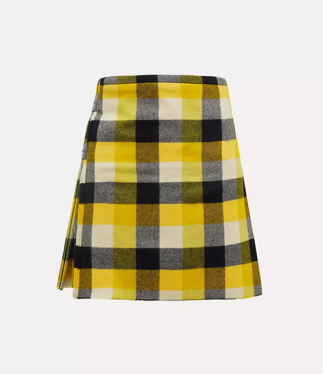 Il mini kilt, capo iconico della maison, è realizzato in lana e rivisitato con il vivace motivo a quadri “Pixel” di questa stagione. La silhouette ad A presenta una cintura a vita alta che scende in una finitura plissettata, con linguette regolabili con fibbia su ciascun lato per una vestibilità su misura.