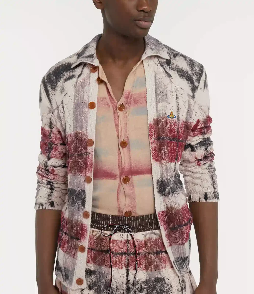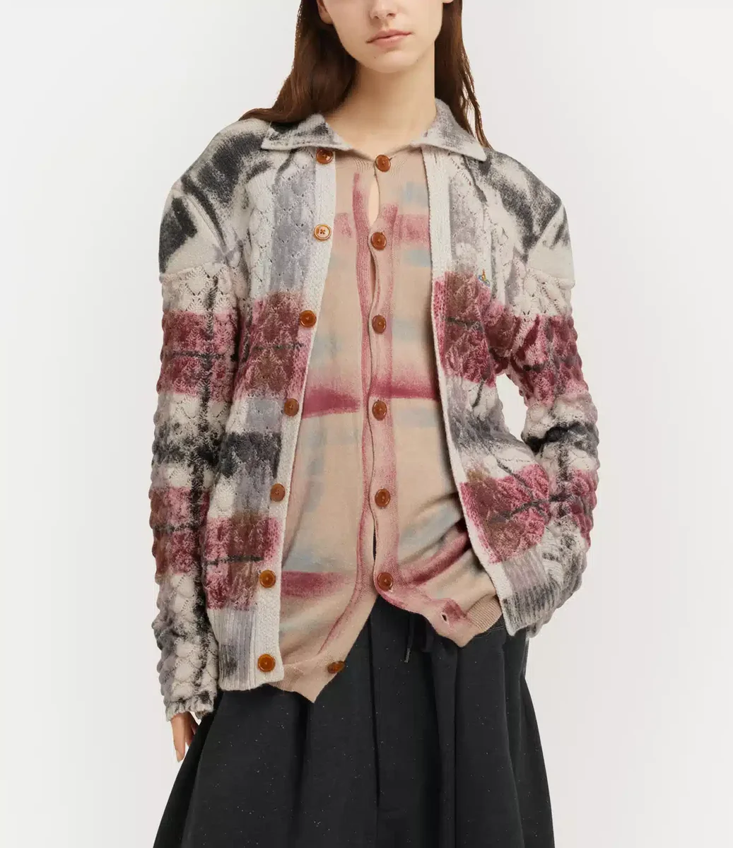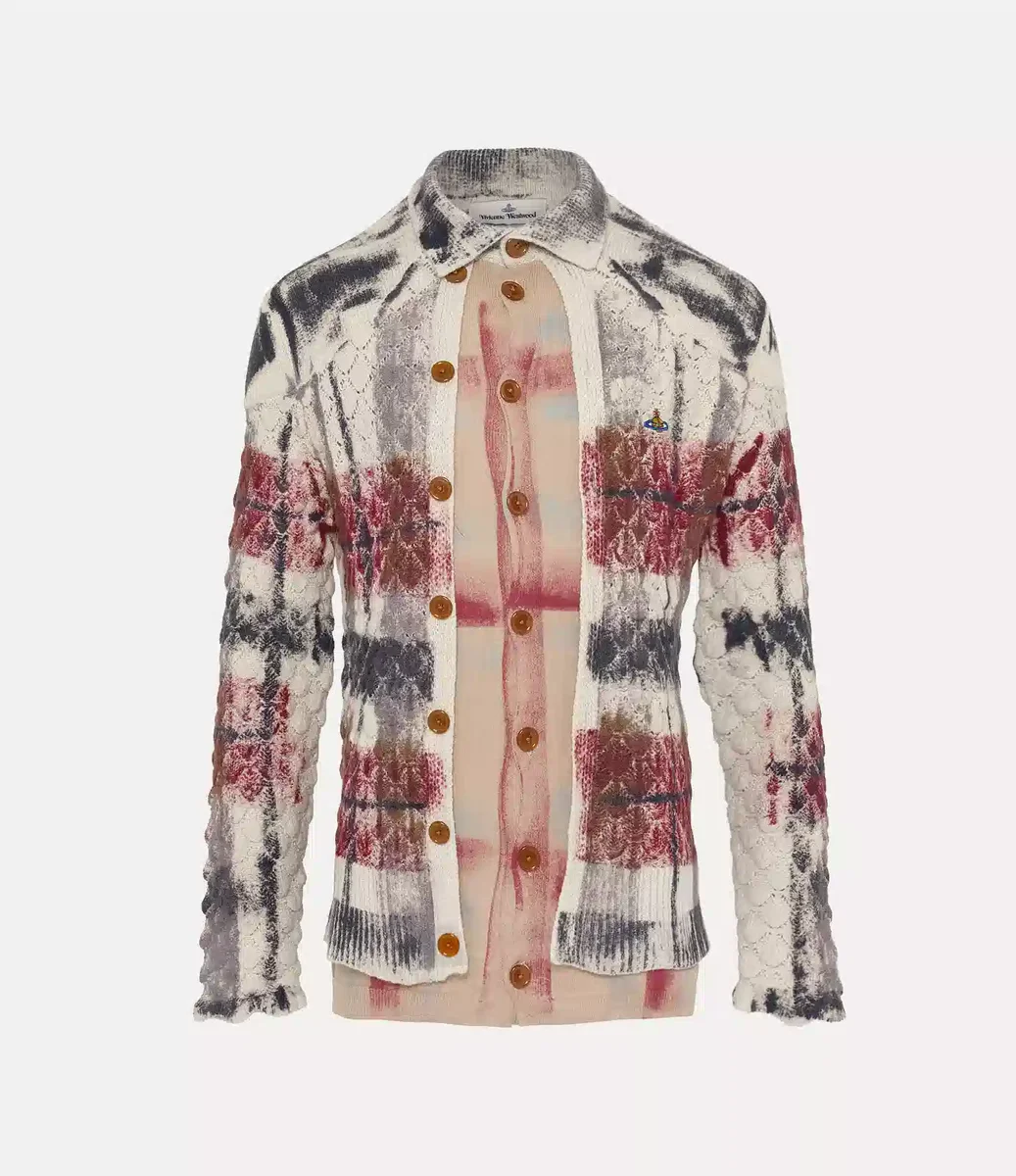 Il cardigan Dual Tartan è realizzato in misto lana e cotone, composto da due strati unici. Lo strato esterno è lavorato a maglia con un delicato motivo a rombi, mentre quello interno presenta una maglia piatta, entrambi rifiniti con stampe tartan applicate a mano e una finitura effetto consumato.