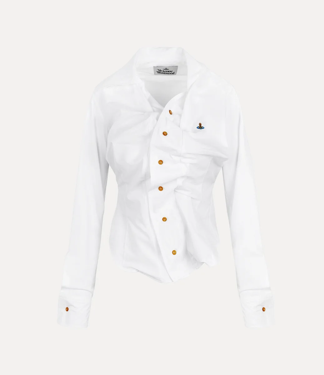 La camicia Drunken di Vivienne Westwood, in cotone, presenta un’abbottonatura decentrata con orlo asimmetrico e chiusura con bottoni.