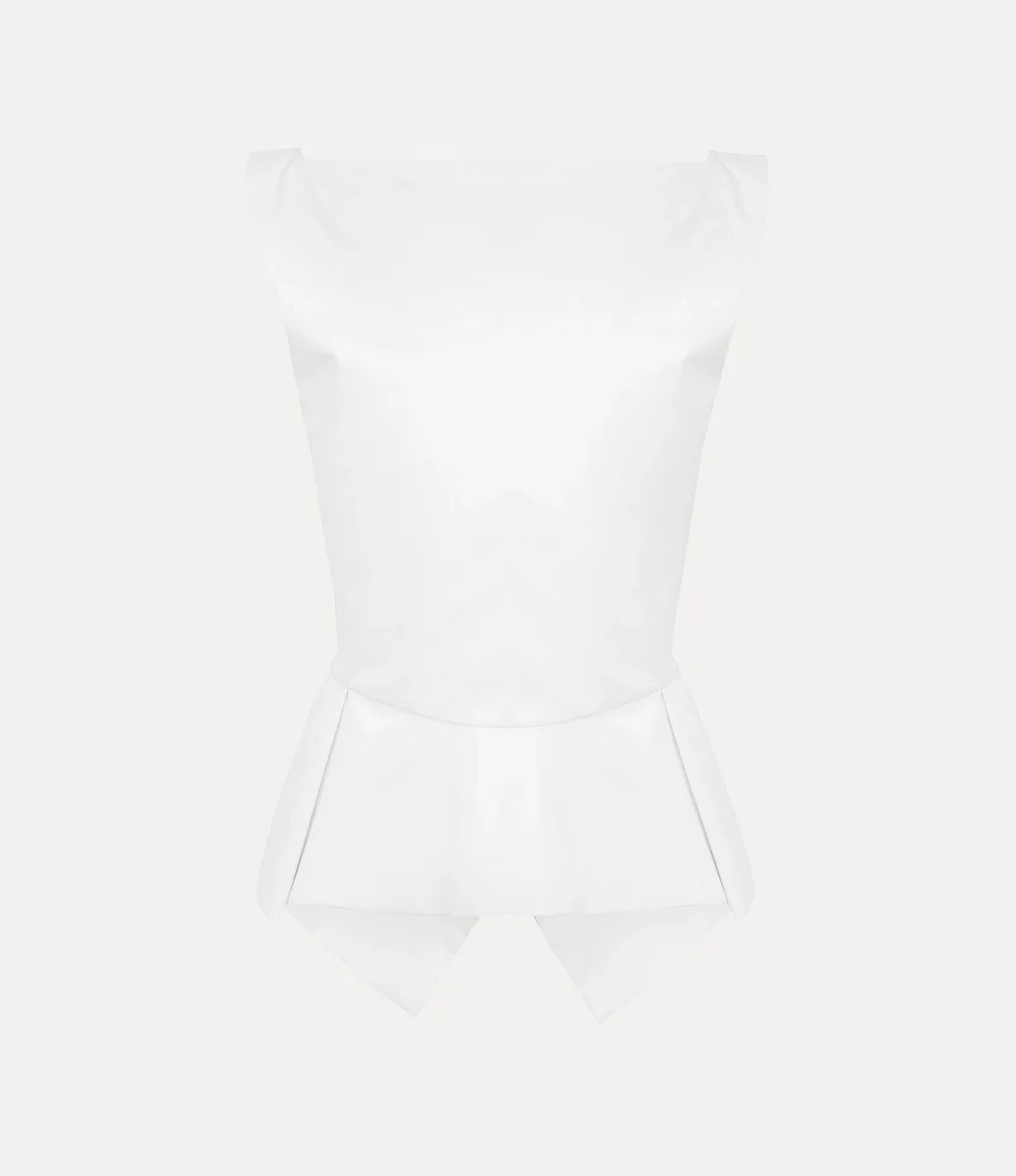 Il nostro gilet Monday riprende una silhouette d’archivio, presentata per la prima volta nella collezione Primavera-Estate 1997, “Viva la Bagatelle”. Il capo presenta un classico scollo quadrato e cade morbidamente in un orlo svasato a peplo che si raccoglie in delicate pieghe e un design a V rovesciata sul davanti.