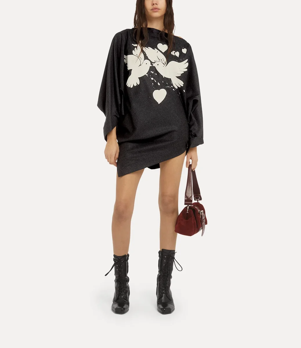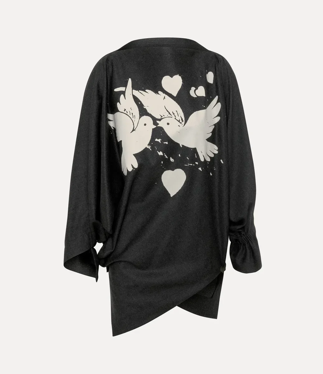 Il nostro top Infinity è realizzato in lana spazzolata metallizzata e decorato con il motivo “Dove and Heart”. Caratterizzato da maniche lunghe che si raccolgono ai polsi, presenta un ampio scollo a barchetta e spalle scese, che creano una silhouette oversize che termina con un orlo asimmetrico.