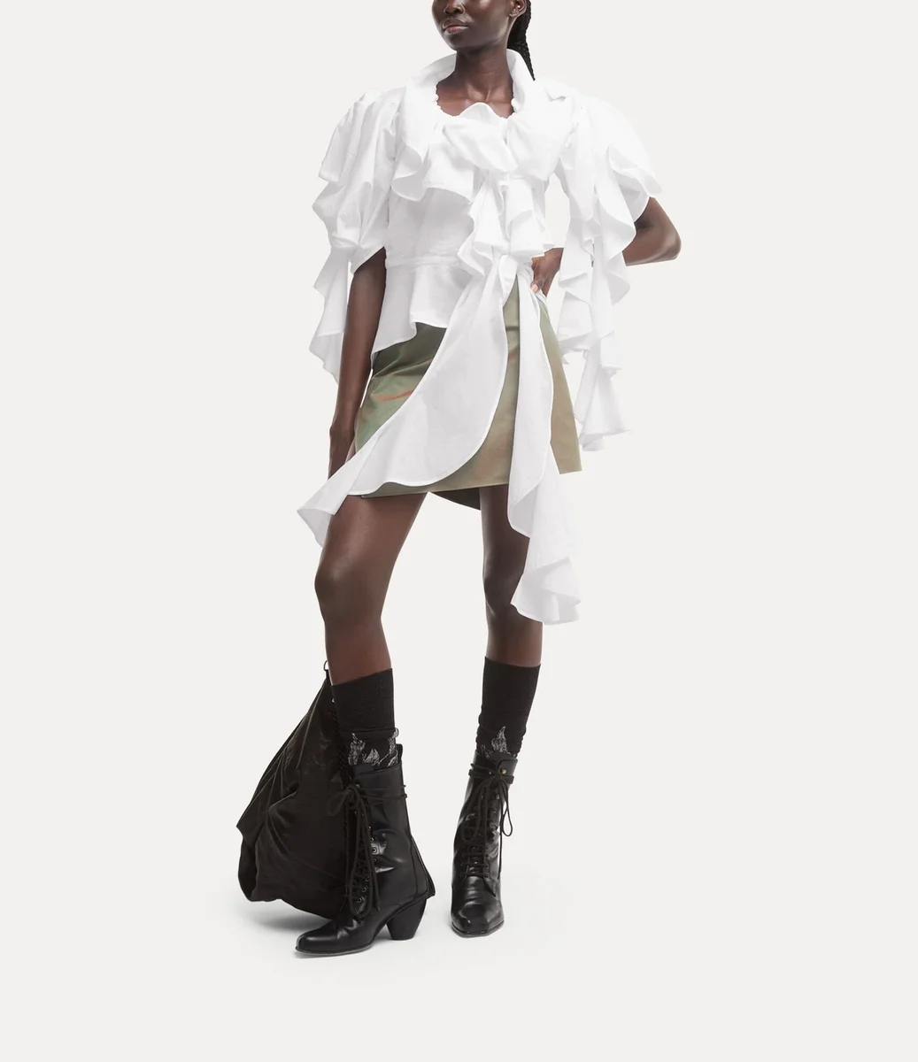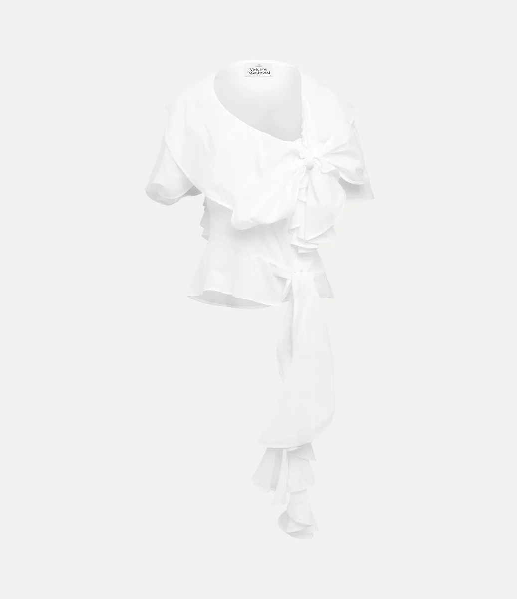 Il nostro top Lola Ruffle ricade sul corpo con un’asimmetria voluta per creare una silhouette voluminosa, rifinita con i motivi a fiocco caratteristici della maison, che scendono a cascata in ampi dettagli a balze. Stringendo in vita, il capo è incorniciato da una scollatura romantica e da maniche leggermente a sbuffo.
