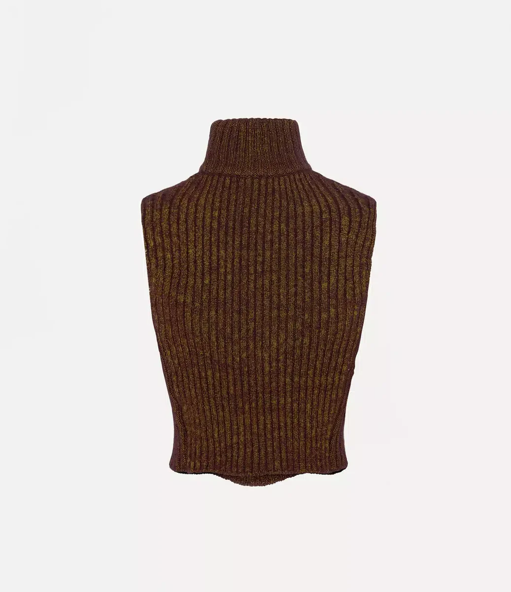 Il top Mary Corset di Vivienne Westwood, realizzato in misto seta e mohair, presenta uno spacco sopra il petto e dettagli a costine lungo il collo alto e il design.