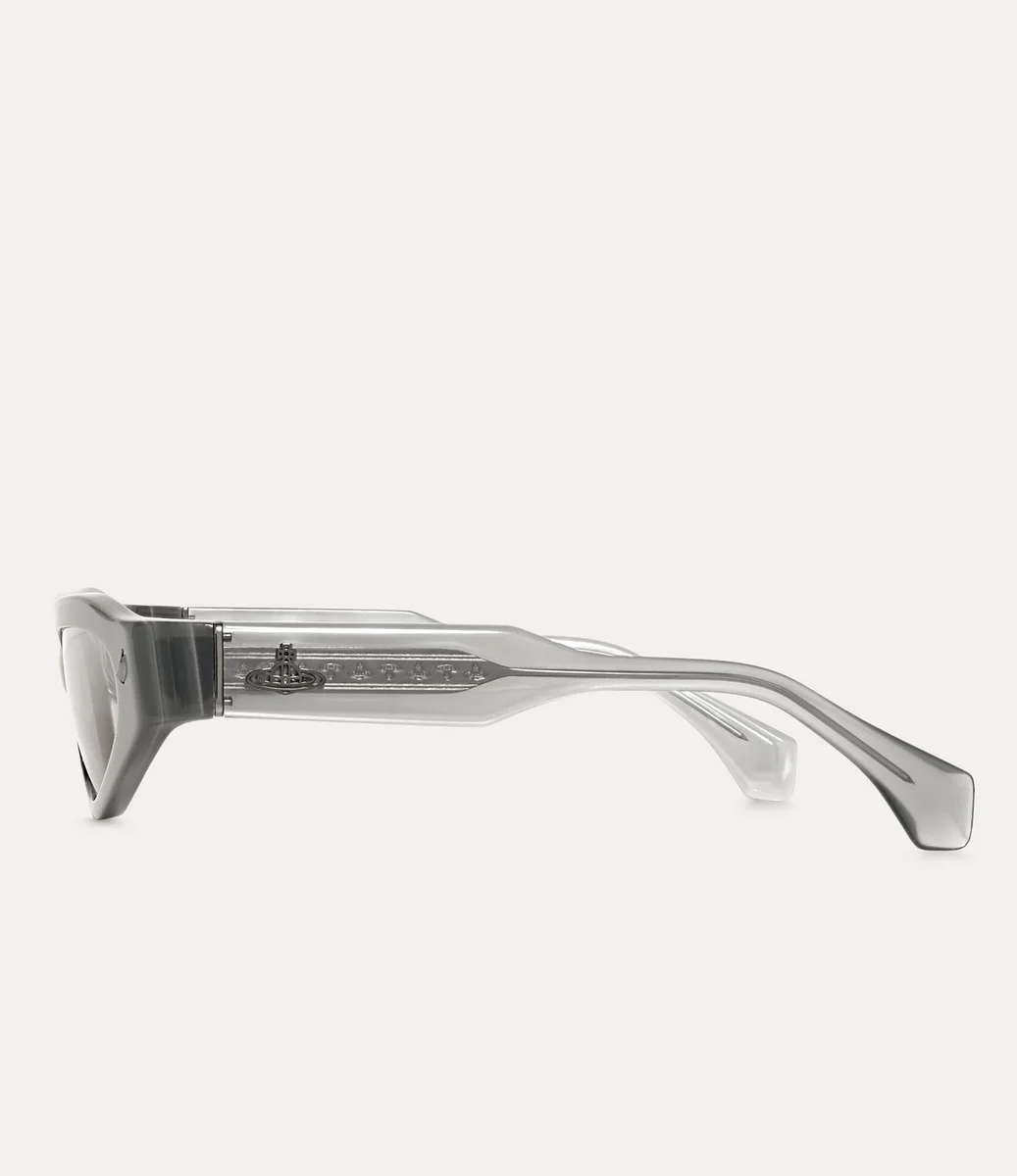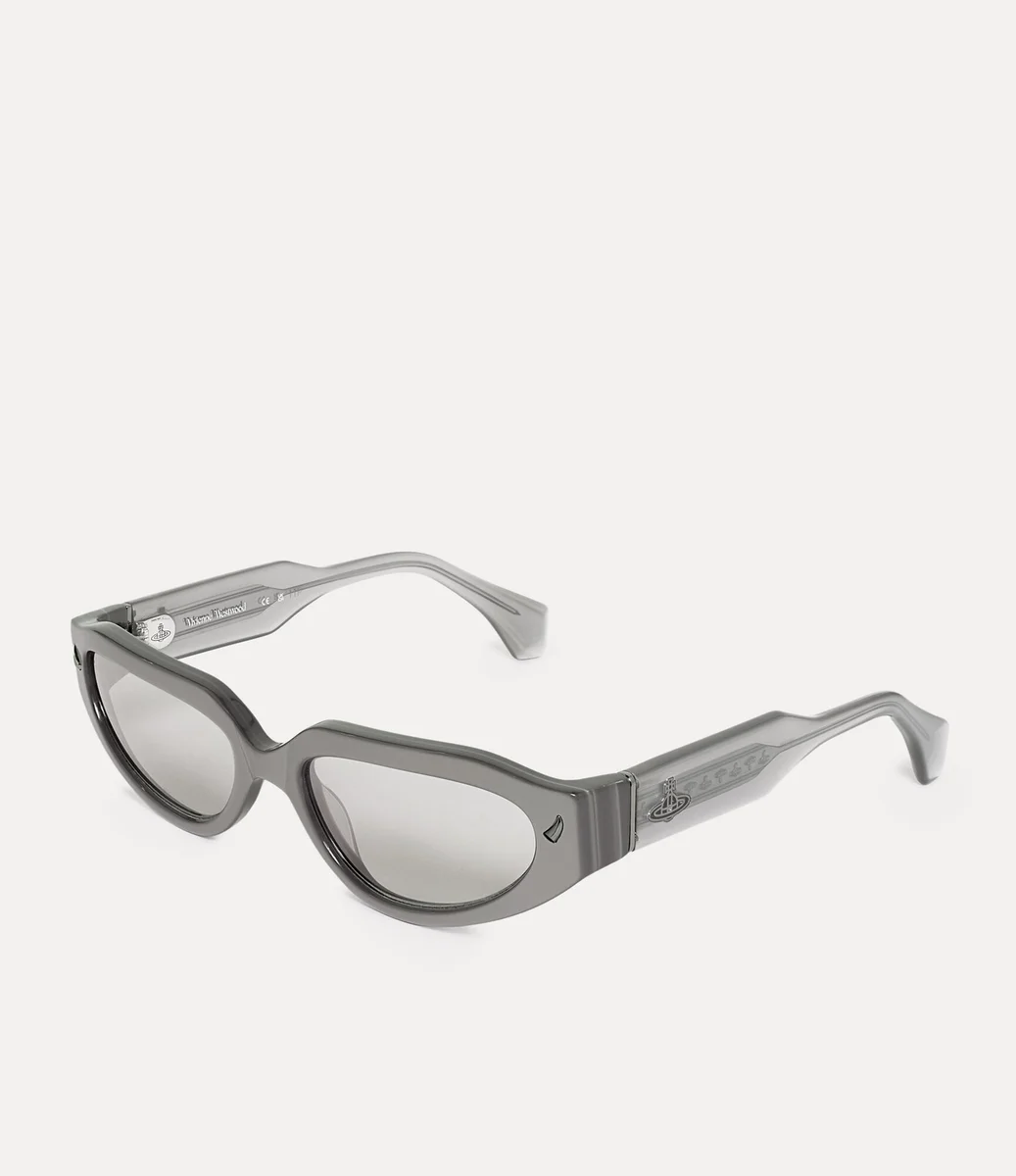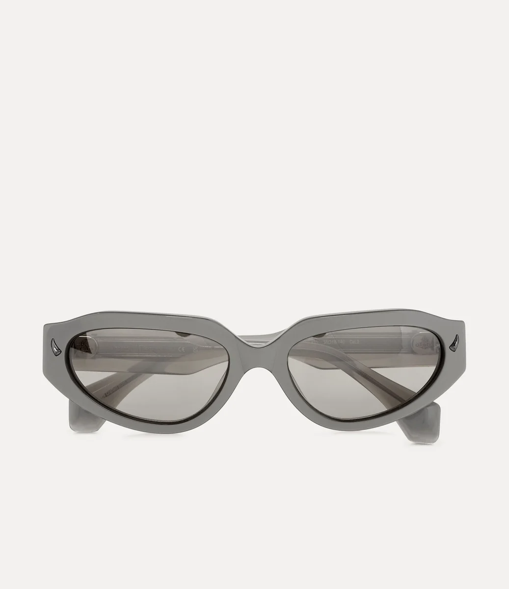 Gli occhiali da sole Grace presentano una silhouette ovale di ispirazione vintage, caratterizzata da un bordo esterno audace e leggermente svasato, che trae ispirazione dal glamour e dalle icone senza tempo dello Studio 54. Disponibili in una finitura argento lucido, il design è impreziosito da lenti colorate tono su tono e decorazioni a forma di corno che adornano il bordo esterno, in omaggio all’iconica fascia Horn Alice di Vivienne.