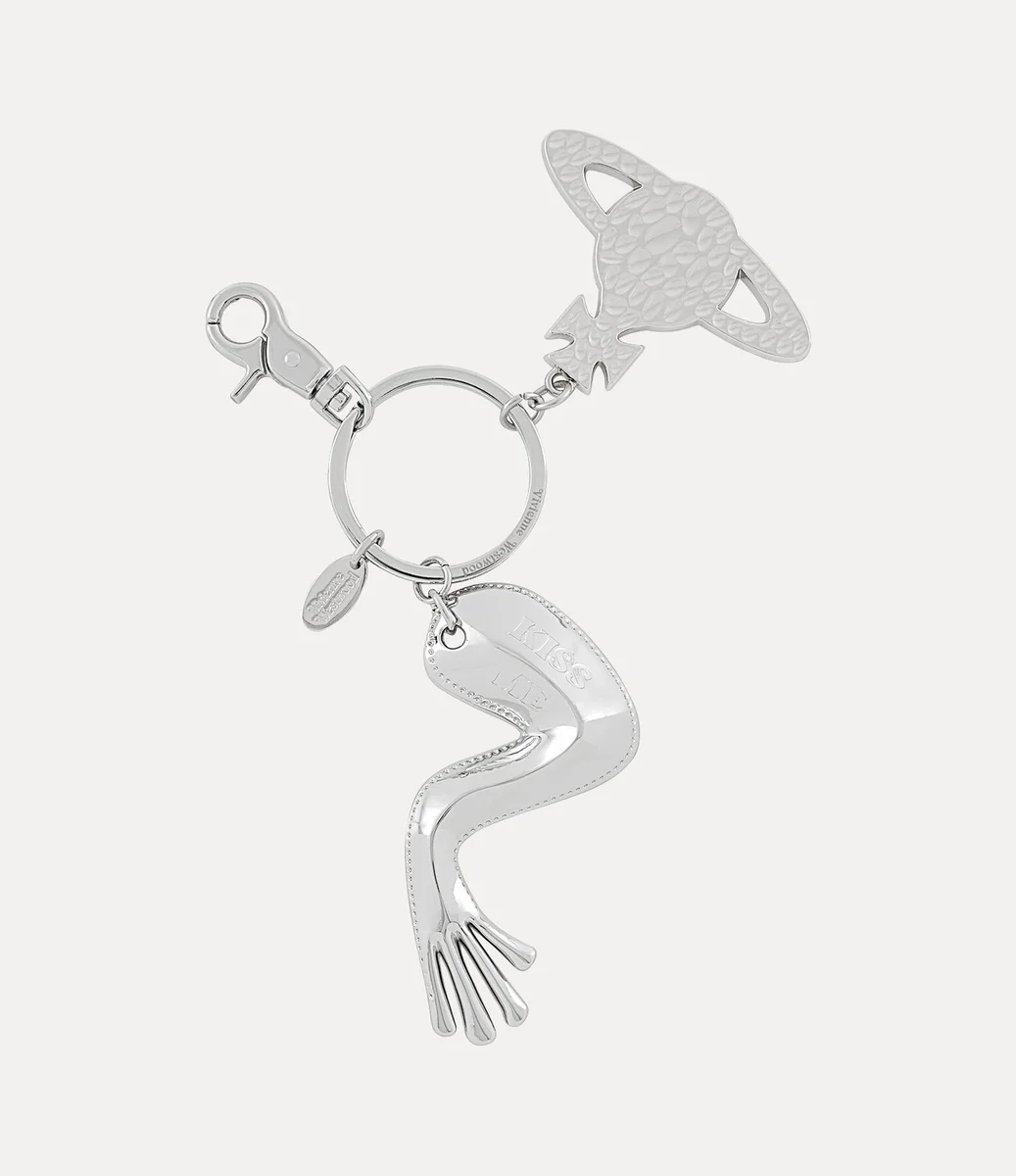 Il nostro portachiavi con charm a forma di zampa di rana, realizzato in argento lucido, strizza l’occhio alla tradizione fiabesca del “bacio alla rana”. Ispirato all’antico decoro a sbalzo, la silhouette ornata della zampa è incisa con lo slogan “Kiss me” e rifinita con il motivo a sfera con effetto “martellato” caratteristico della maison.