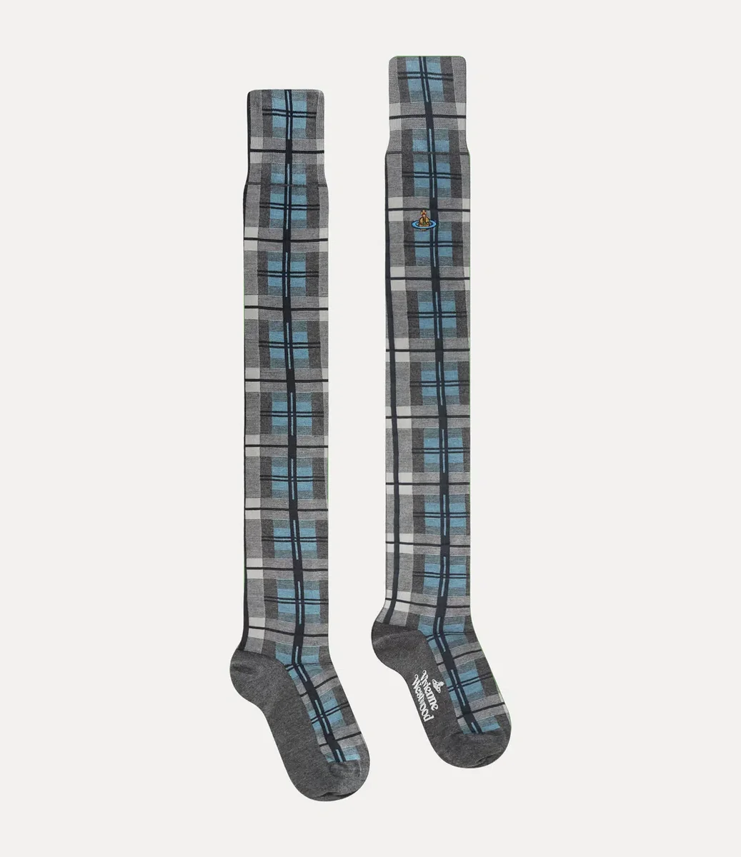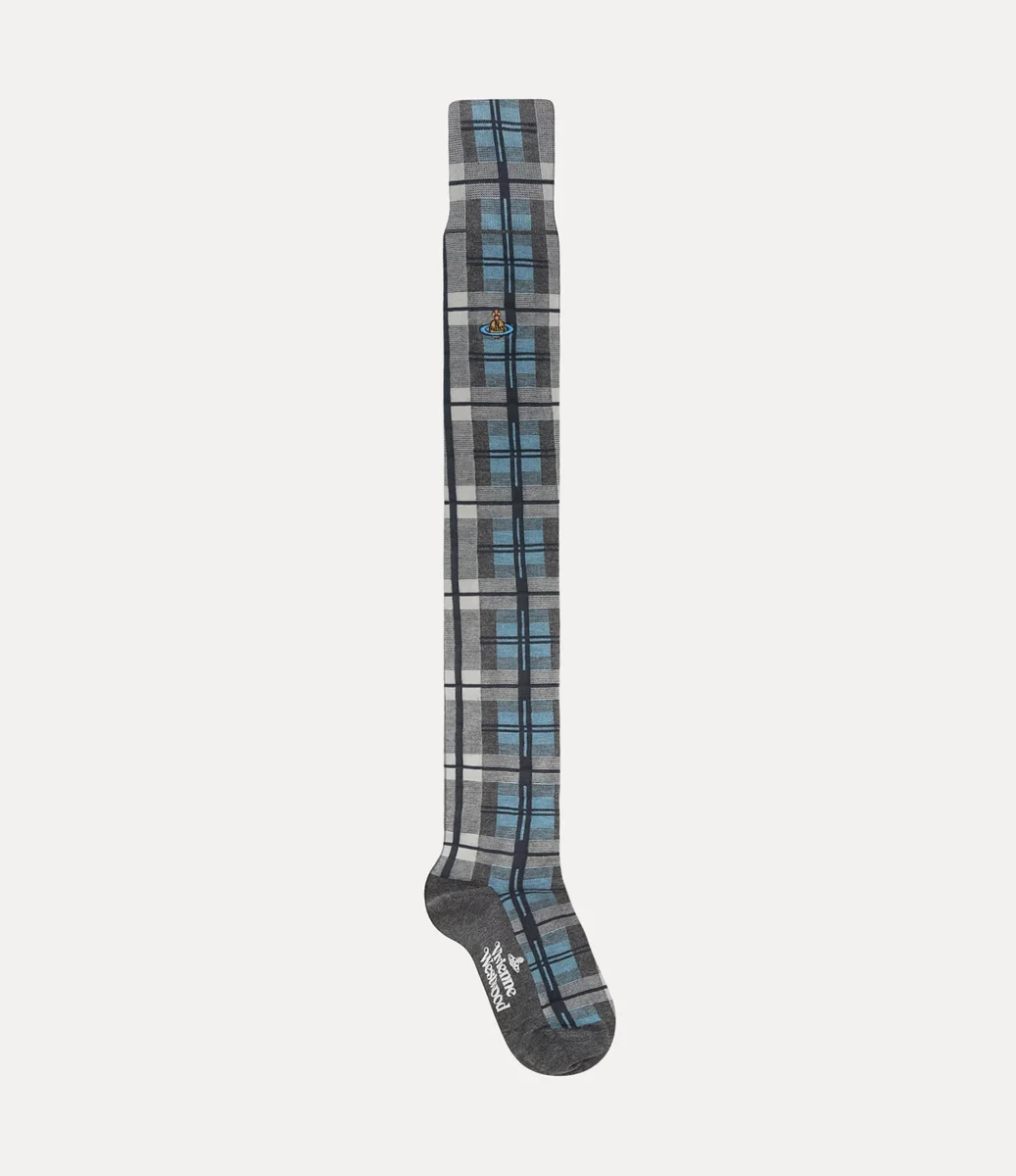 I calzini Over The Knee propongono il sorprendente tartan “Moonshine” di questa stagione e sono realizzati in misto lana merino extrafine. Il paio è rifinito con il motivo orb della maison ricamato con filo multicolore, che simboleggia la tradizione, circondato dagli anelli celesti di Saturno, che simboleggiano il futuro.