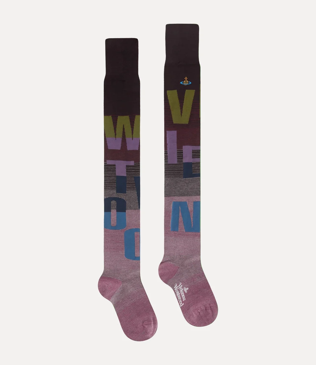 I calzini Over The Knee presentano il sorprendente jacquard “Logomania” di questa stagione e sono realizzati in misto lana merino extrafine. Il paio è rifinito con il motivo orb della maison ricamato con filo multicolore, che simboleggia la tradizione, circondato dagli anelli celesti di Saturno, che simboleggiano il futuro.