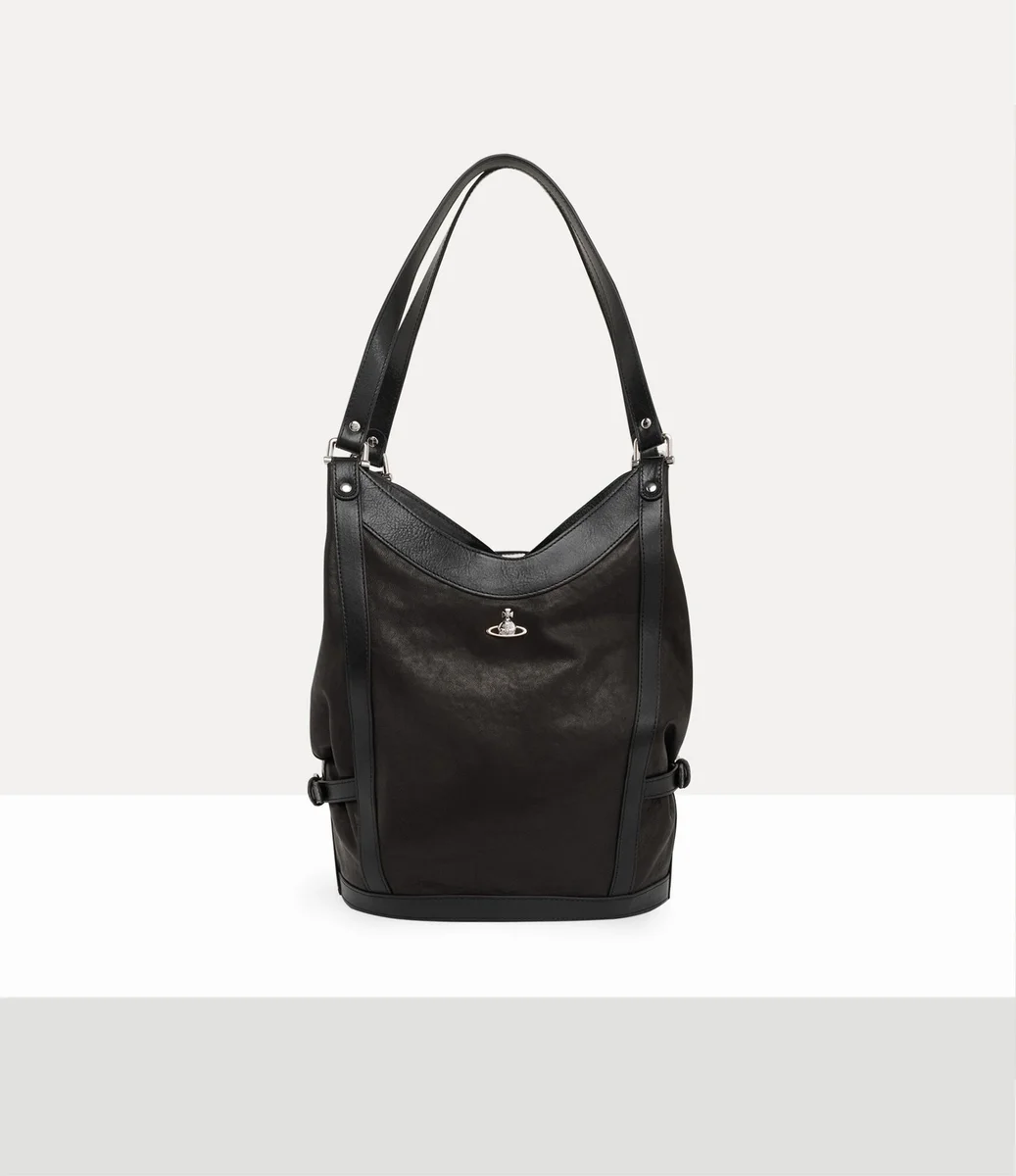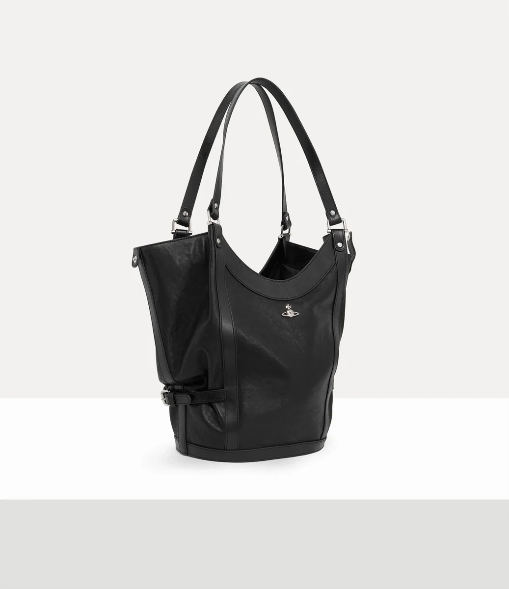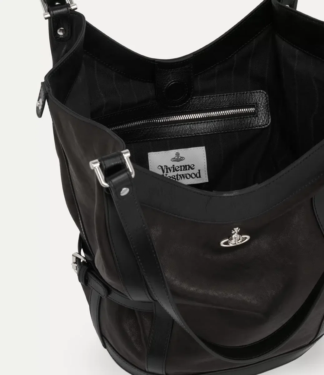 La borsa a tracolla grande Olive è realizzata in morbida pelle e foderata con il nostro caratteristico motivo “Broken Pinstripe”, introdotto per la prima volta nella collezione Autunno-Inverno 2015 di Vivienne Gold Label. Progettata con una silhouette morbida e morbida, il pezzo è impreziosito da cinghie in stile bondage che stringono la forma come un’imbracatura.