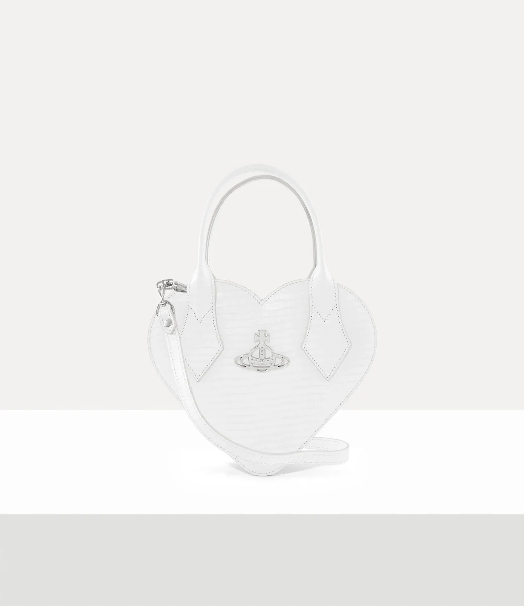 La borsa a tracolla Josephine Heart di Vivienne Westwood in pelle goffrata effetto coccodrillo presenta un design a forma di cuore con manico superiore e globo sul pannello frontale.
