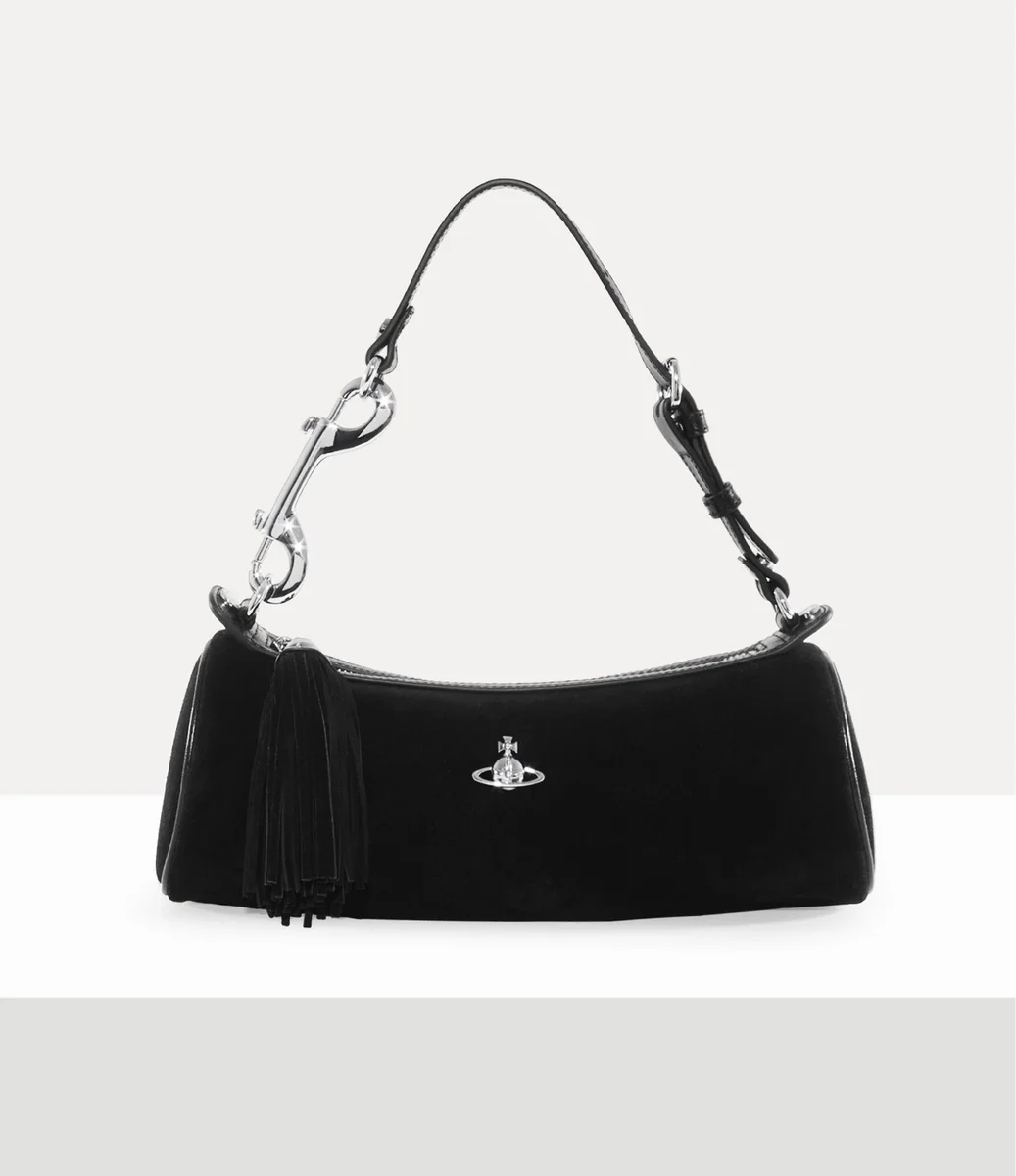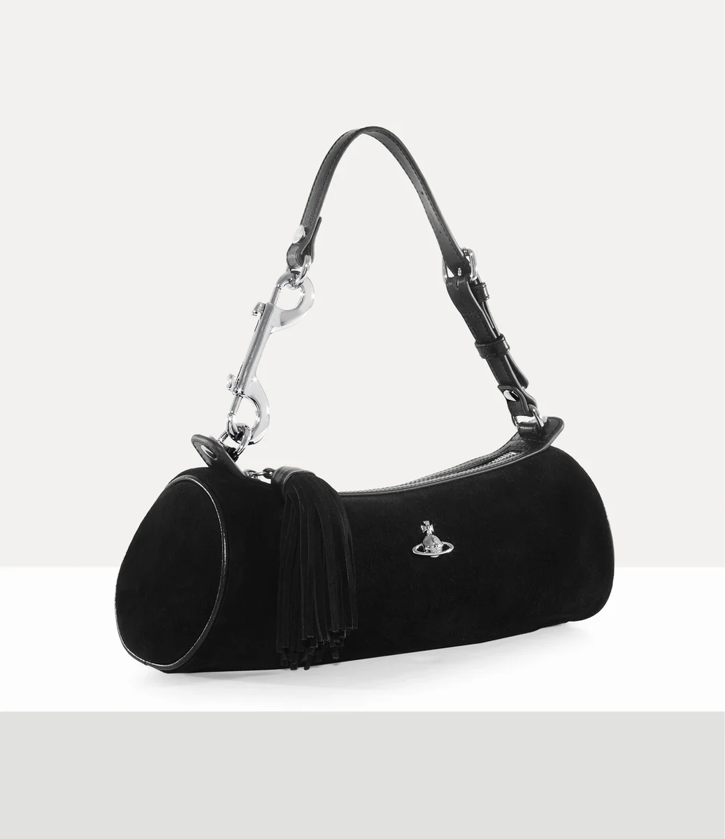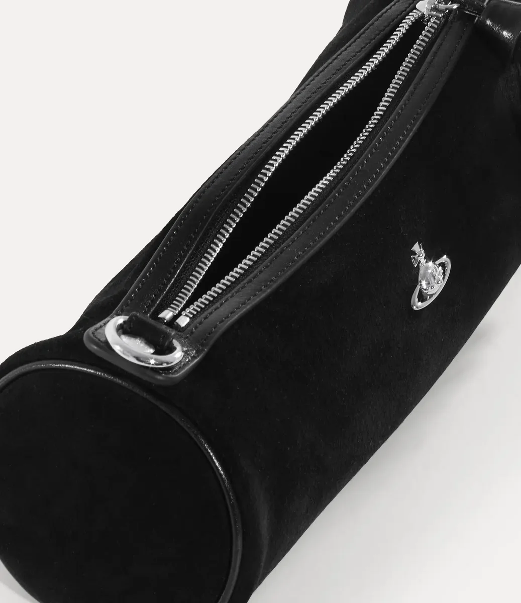 La borsa Cindy Cylinder di Vivienne Westwood è realizzata in morbida pelle scamosciata e rifinita con il caratteristico globo in bassorilievo sul davanti.
