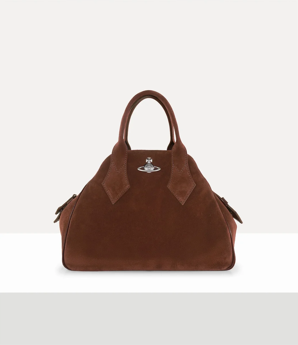 La nostra borsa Yasmine Medium è stata ripensata in morbida pelle scamosciata, con doppio manico superiore. L’interno è foderato con il motivo “Broken Pinstripe”, firma della maison, una reinterpretazione del classico motivo gessato, introdotto per la prima volta nella collezione Autunno-Inverno 2015 di Vivienne Westwood Gold Label.
