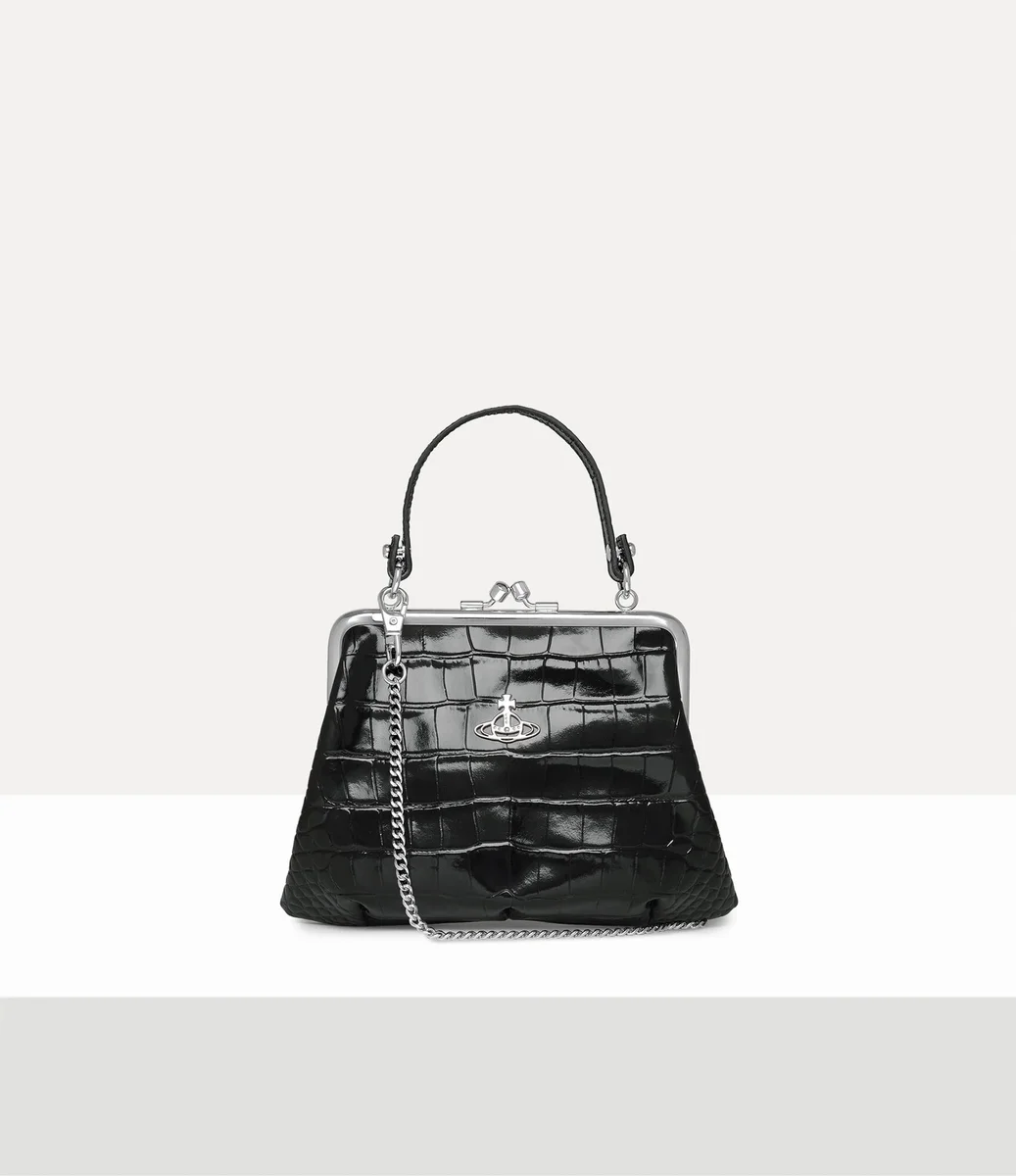 La silhouette della borsa Granny Frame ricorda i portamonete antichi dell’inizio del XX secolo, con una struttura in metallo e una chiusura a scatto sicura. Il modello presenta una goffratura effetto coccodrillo su tutto il design, completata dal nostro classico motivo a sfere sulla parte frontale, sinonimo della filosofia della maison di proiettare il passato nel futuro.