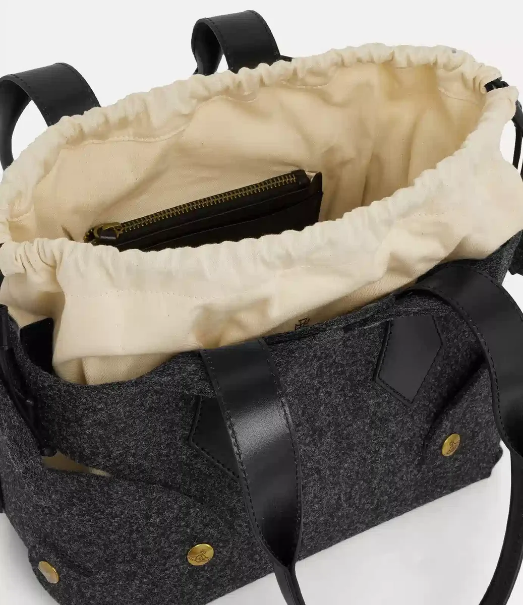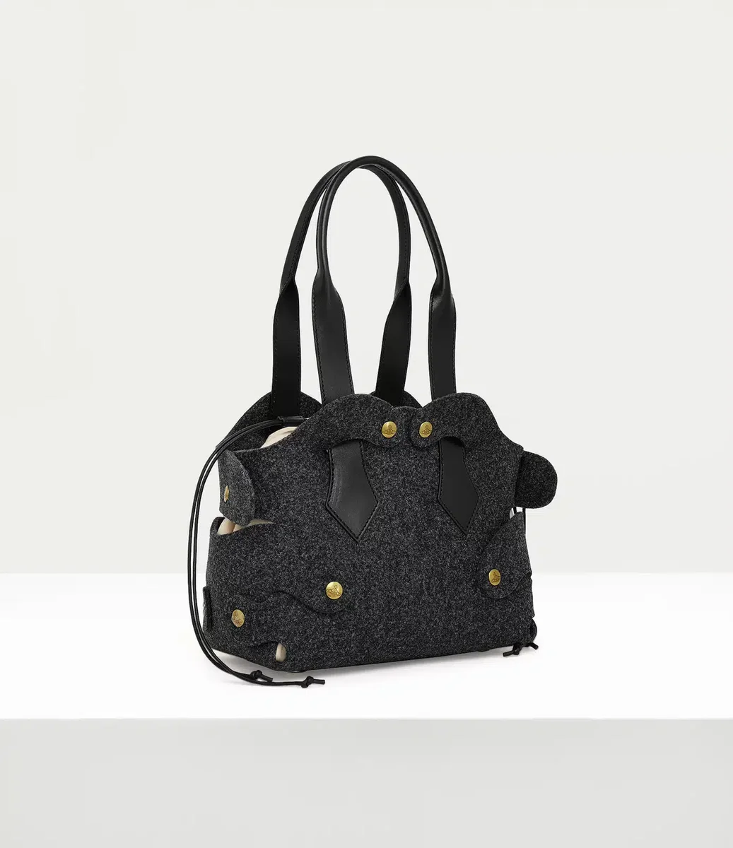 La borsa Wilma Small è realizzata in feltro di lana spesso utilizzando una tecnica di taglio senza sprechi sviluppata per la prima volta per la collezione Autunno-Inverno 2007 “Wake Up Cavegirl”. Ispirata alle nostre borse Flintstone d’archivio, la borsa è dotata di un sistema modulare di bottoni a pressione e dei caratteristici manici a forma di punta di lancia infilati nel rivestimento esterno.