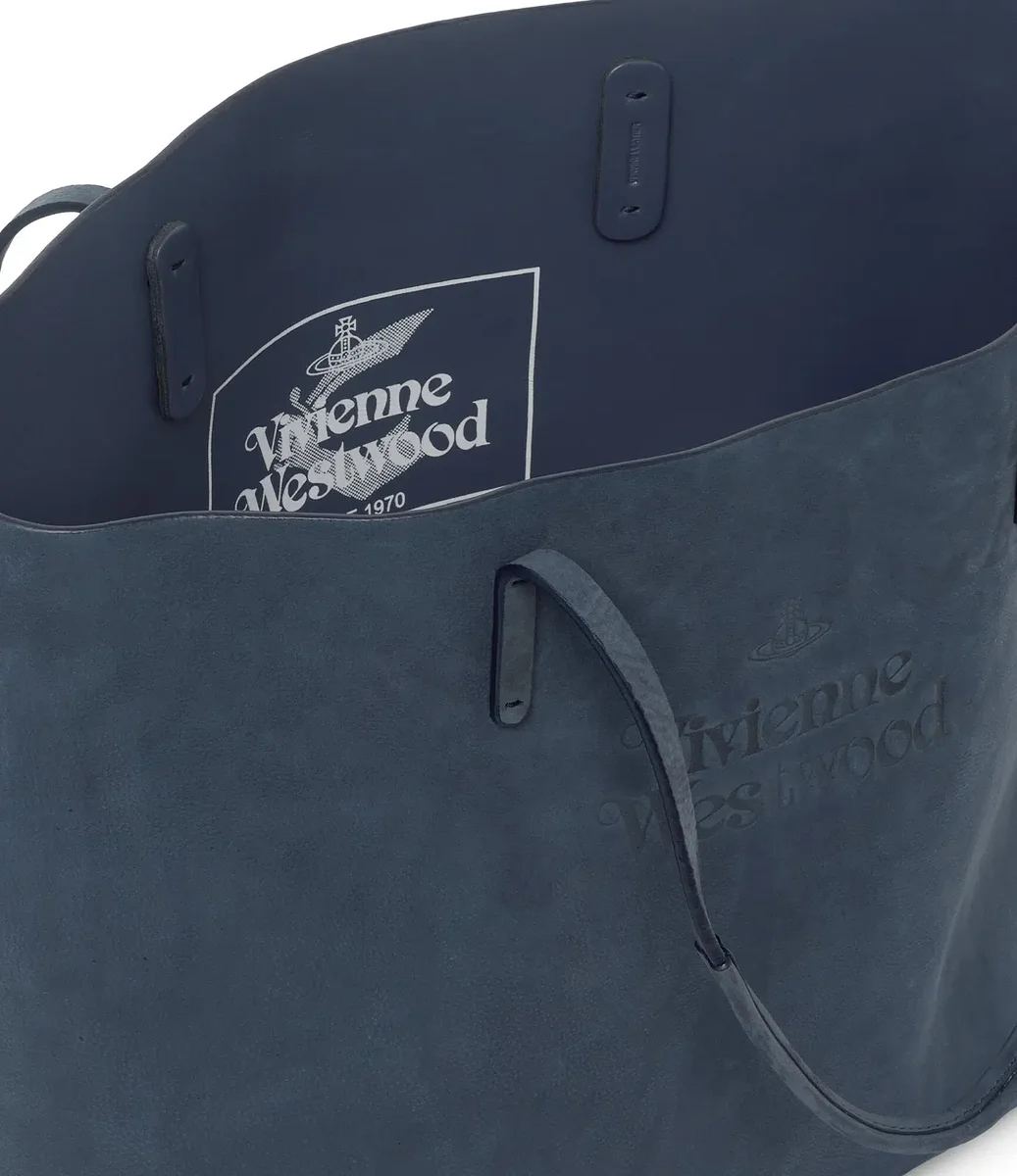 La borsa Studio Shopper fa parte della nostra collezione Made in Kenya, creata in collaborazione con Ethical Fashion Initiative. Realizzata in pelle nabuk blu, il design presenta un pannello frontale goffrato decorato con il motivo orb e lettering caratteristico della maison.