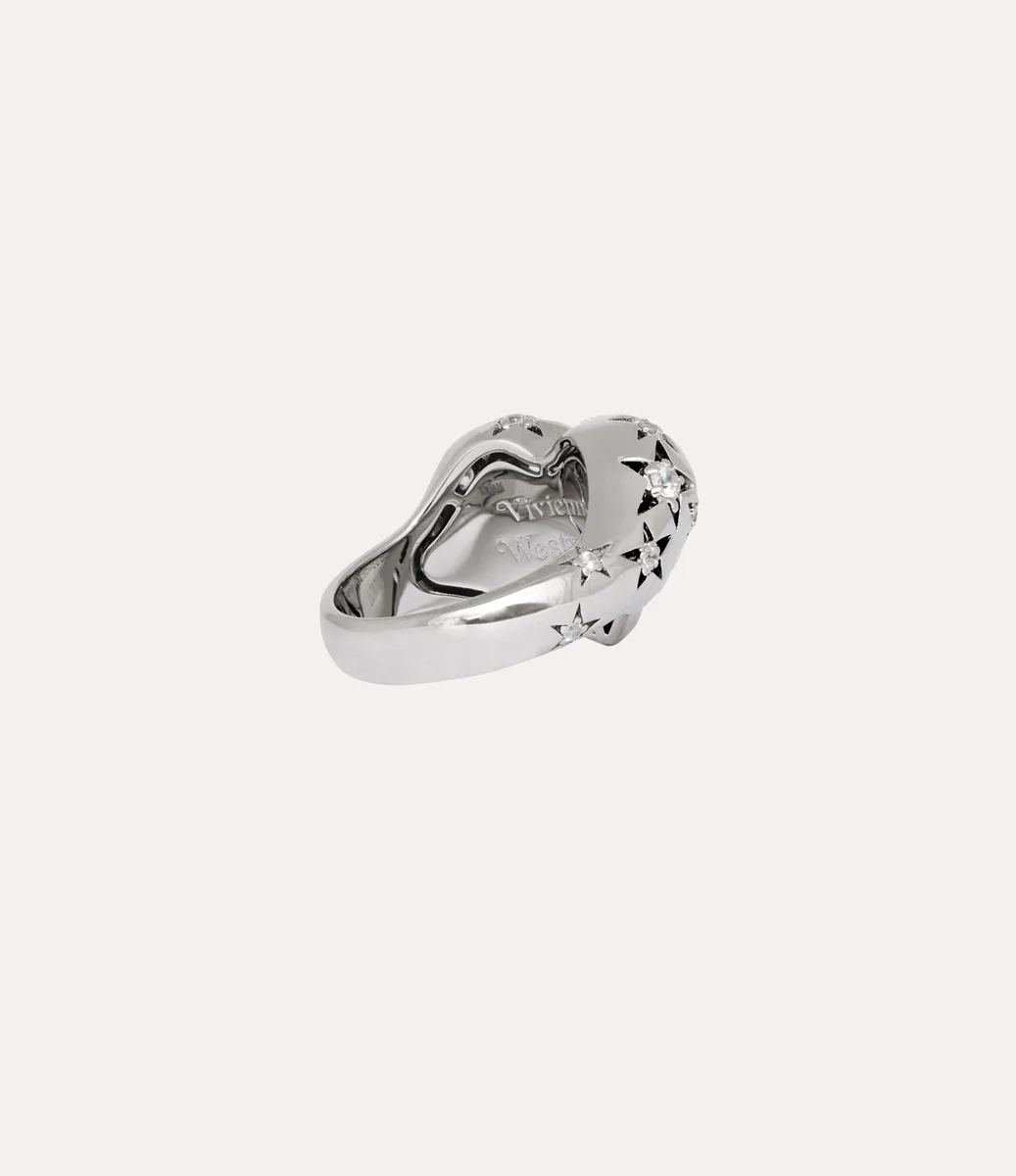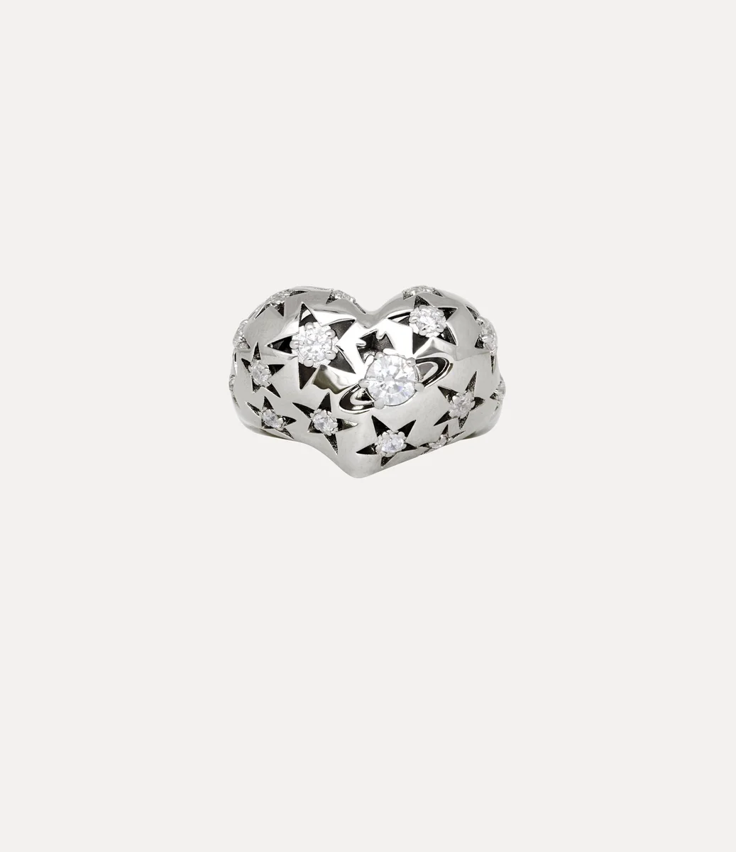 Il nostro anello Lee è scolpito in argento riciclato e rifinito con una radiosa placcatura color platino. La parte frontale ha la forma di un cuore asimmetrico, un omaggio all’affetto di Vivienne per l’umanità e il pianeta, completato da motivi a forma di stelle e sfere incastonate di cristalli sparsi su tutta la superficie.