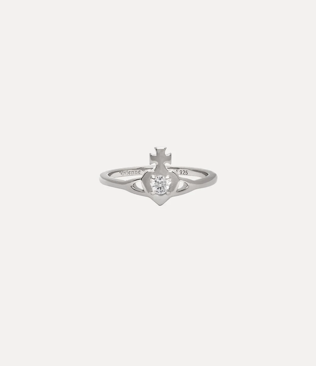 La forma a cuore rimane un elemento classico dell’iconografia della maison, che richiama l’affetto di Vivienne per l’umanità e il pianeta. Il nostro anello Noella ripropone il motivo, completato da una placcatura lucida color platino e da decorazioni in cristallo bianco.