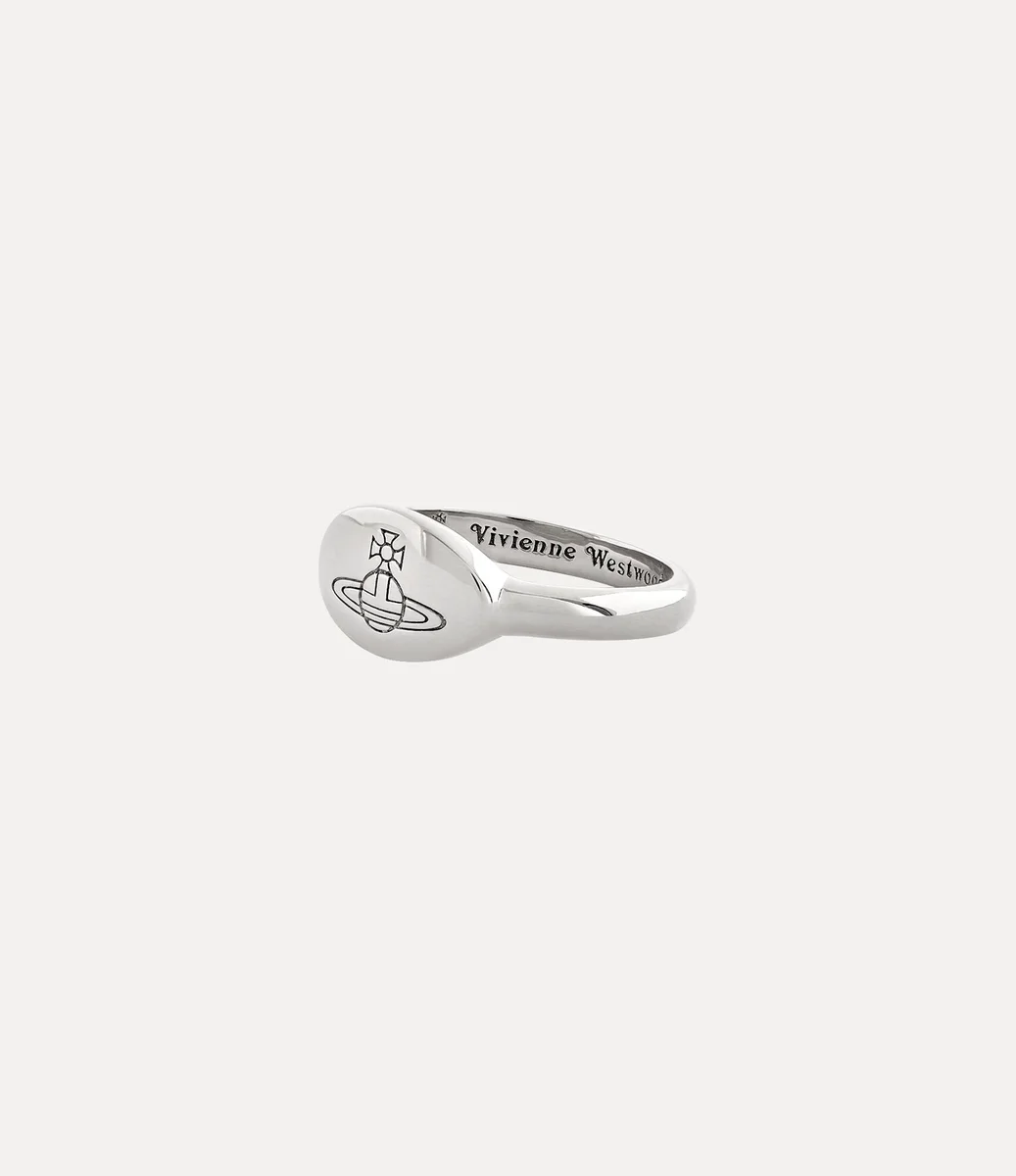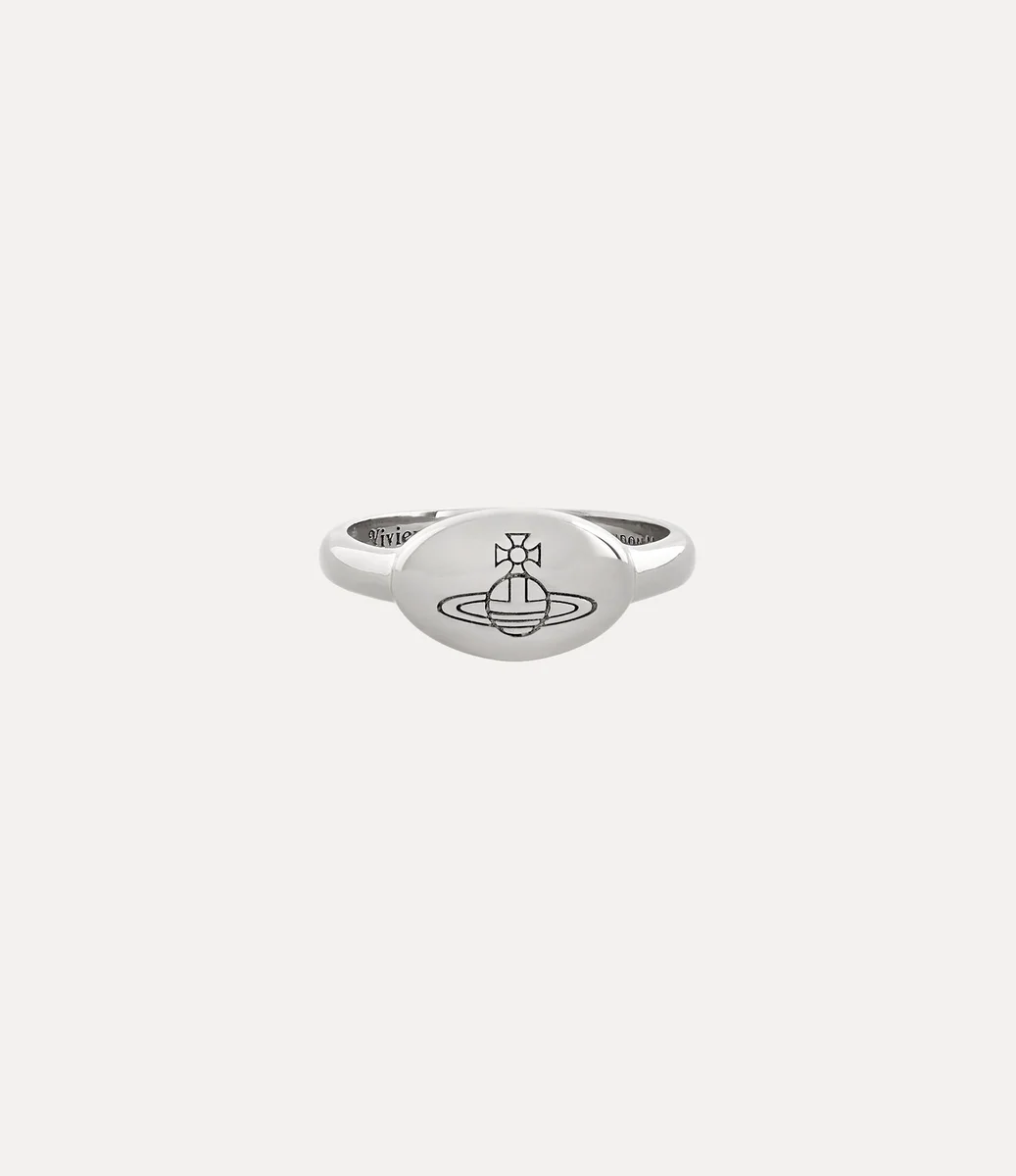 Il nostro anello Tilly presenta una classica silhouette a sigillo, con finitura in argento riciclato, impreziosita da una placcatura color platino. Questo gioiello è decorato con una faccia ovale, caratterizzata da un’incisione del nostro caratteristico globo, arricchita da una patina che ne esalta il design complessivo, richiamando la visione di Vivienne di proiettare la tradizione nel futuro.