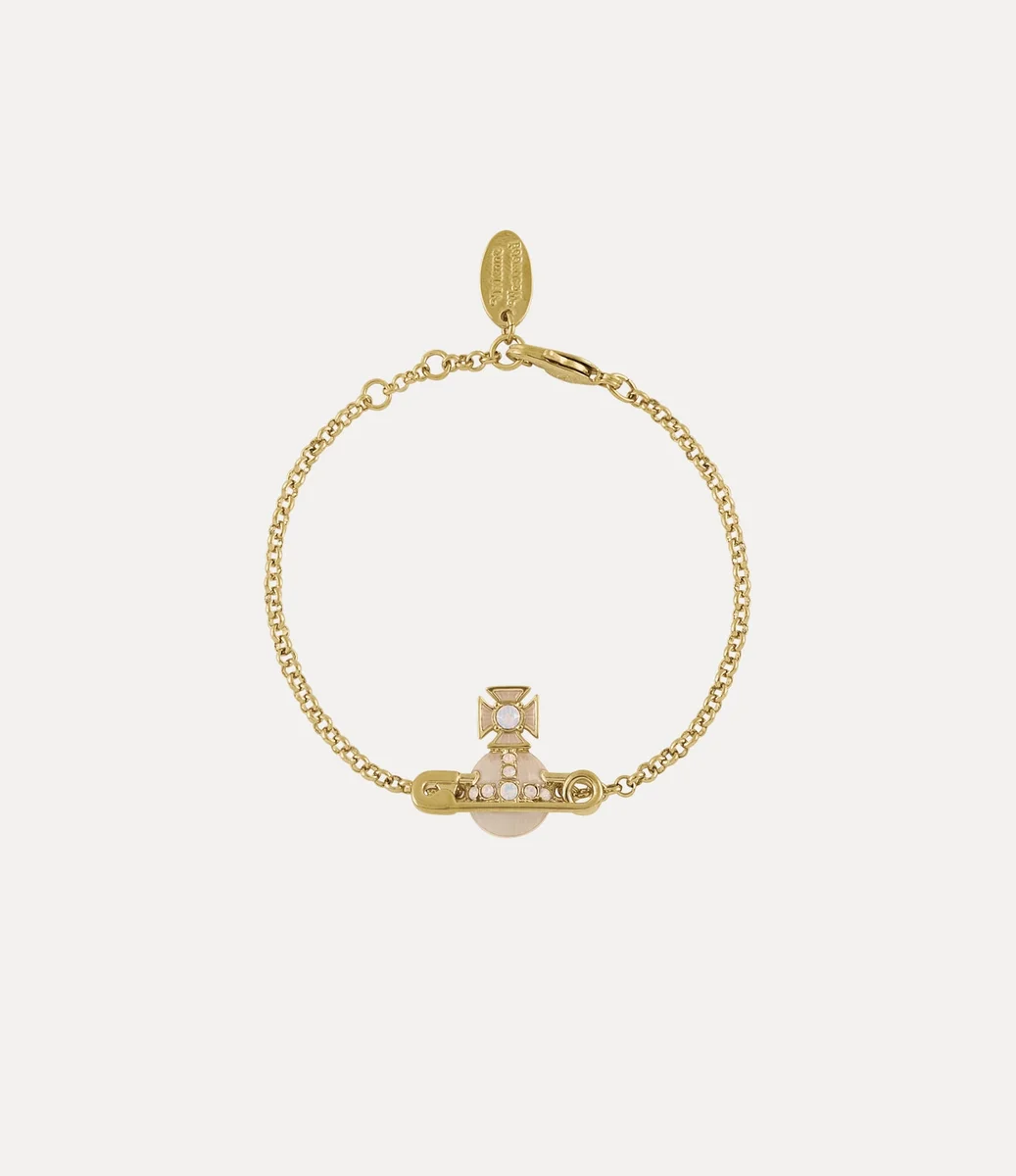 Il nostro bracciale Kitty è stato ripensato in questa stagione con una placcatura lucida color oro e dettagli classici. Il motivo centrale a sfera è accentuato da smalto traslucido dipinto a mano e traforato con un classico motivo a spilla da balia, un omaggio all’estetica punk tipica di Vivienne.