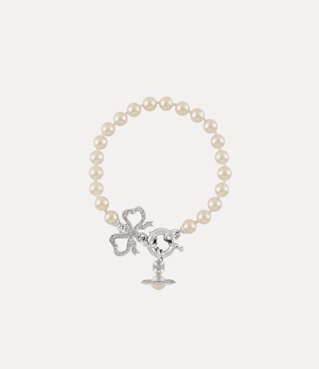 Il bracciale Rigoberta Pearl color argento presenta un ciondolo a forma di farfalla con fiocco, impreziosito da perle opulente e dettagli in cristallo.