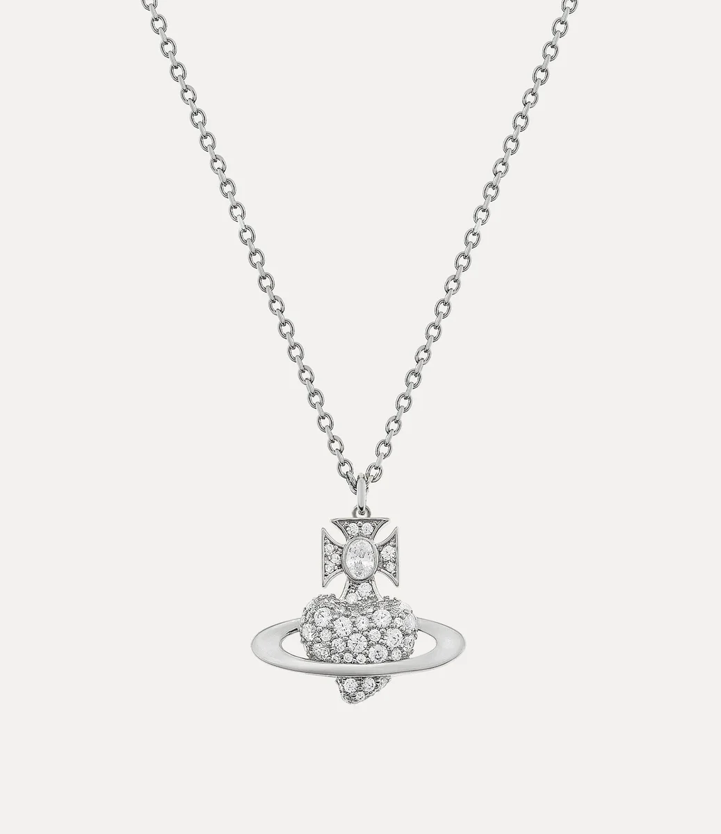 La nostra collana con pendente Agnatha Bas Relief di Valentine riprende un design asimmetrico a forma di cuore d’archivio, che riflette l’amore di Vivienne per l’umanità e il pianeta. Il pendente a forma di cuore, impreziosito da scintillanti dettagli in cristallo bianco, è circondato dagli anelli celesti di Saturno in smalto bianco, che simboleggiano il futuro, ed è impreziosito da una placcatura lucida color argento.