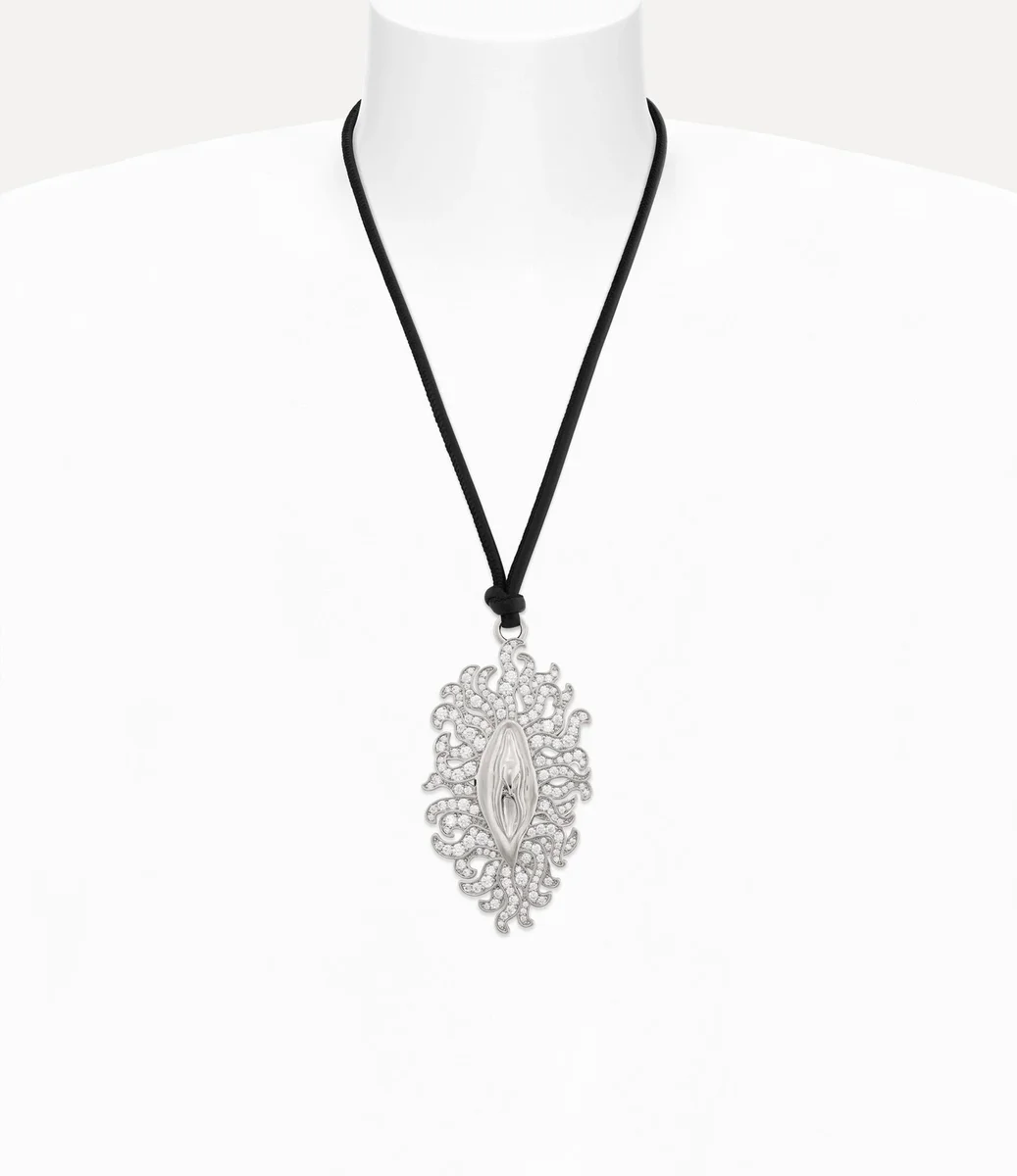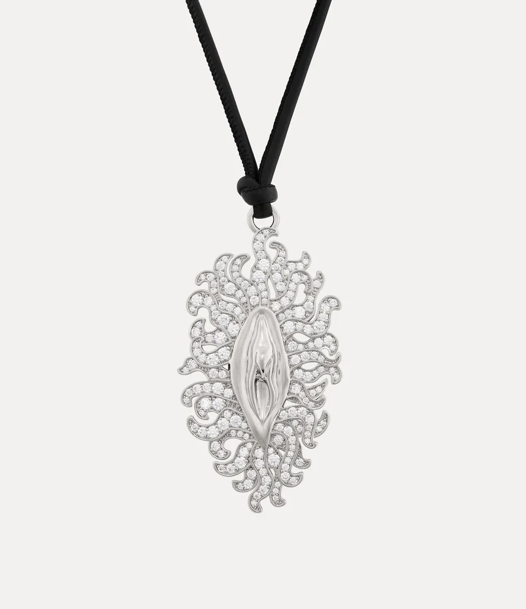La collana con pendente Floriana si ispira all’iconico motivo “Vagina” della maison, presentato per la prima volta sulla passerella di Andreas Kronthaler per Vivienne Westwood Autunno-Inverno 2019/2020. Il motivo audace, impreziosito da cristalli bianchi, è appeso a un cordino regolabile in pelle italiana nera e riflette l’ammirazione di Vivienne per l’arte antica, dove era spesso associato a temi di fertilità o forza.