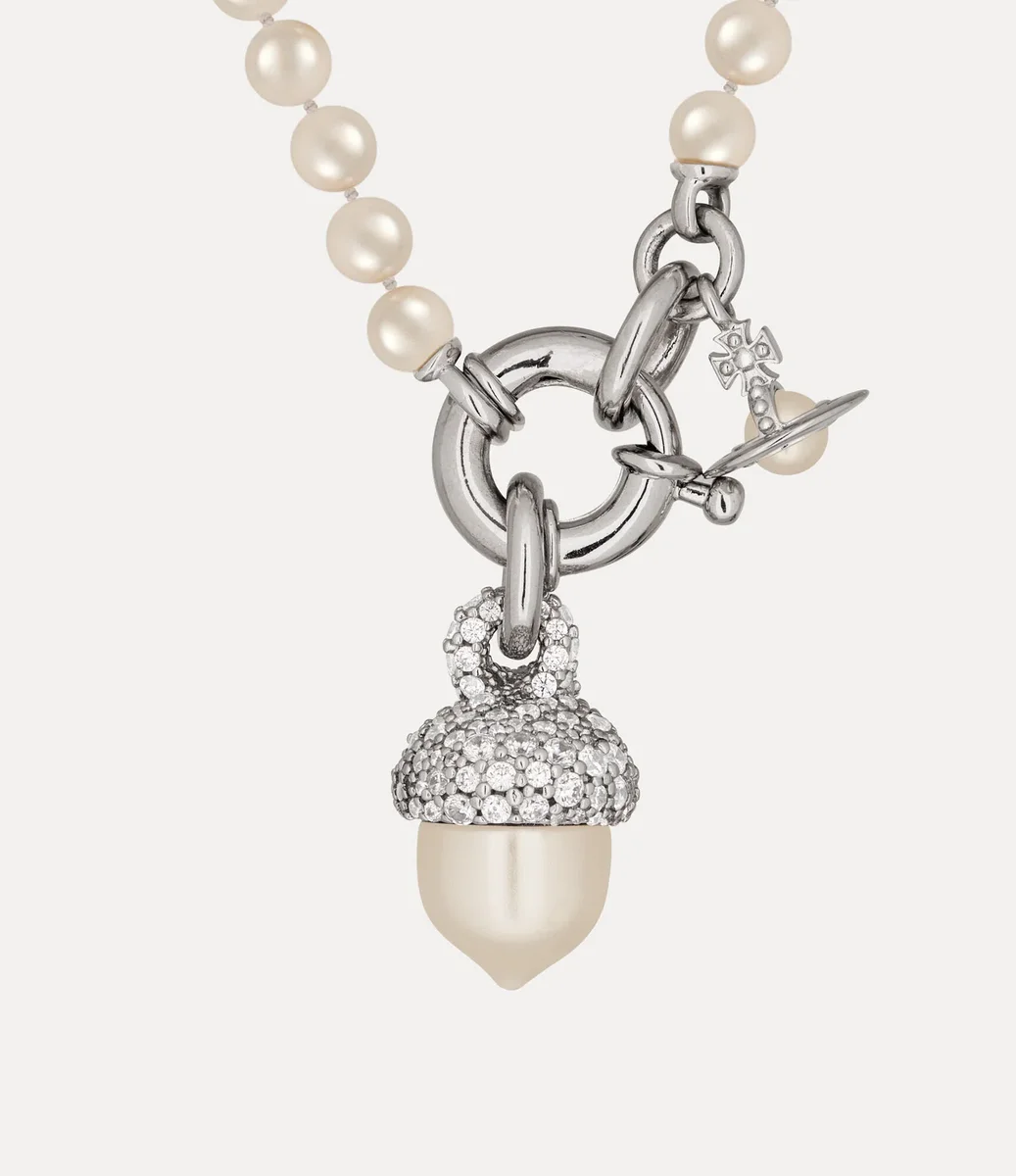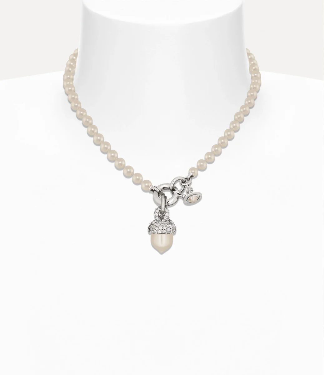 La collana Lucille Pearl evoca un senso di grandiosità e lusso, con una fila di scintillanti perle di vetro Swarovski. Al centro, un motivo a ghianda impreziosito da pavé con una lucente finitura perlata è sospeso accanto a una sfera di perle, racchiusa in una struttura in metallo lucido color argento.
