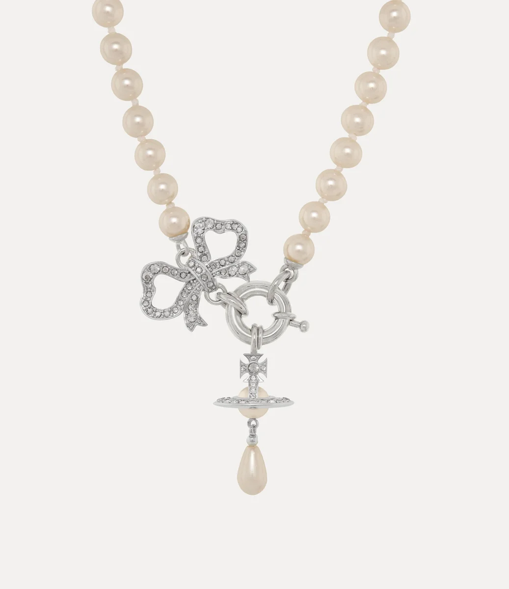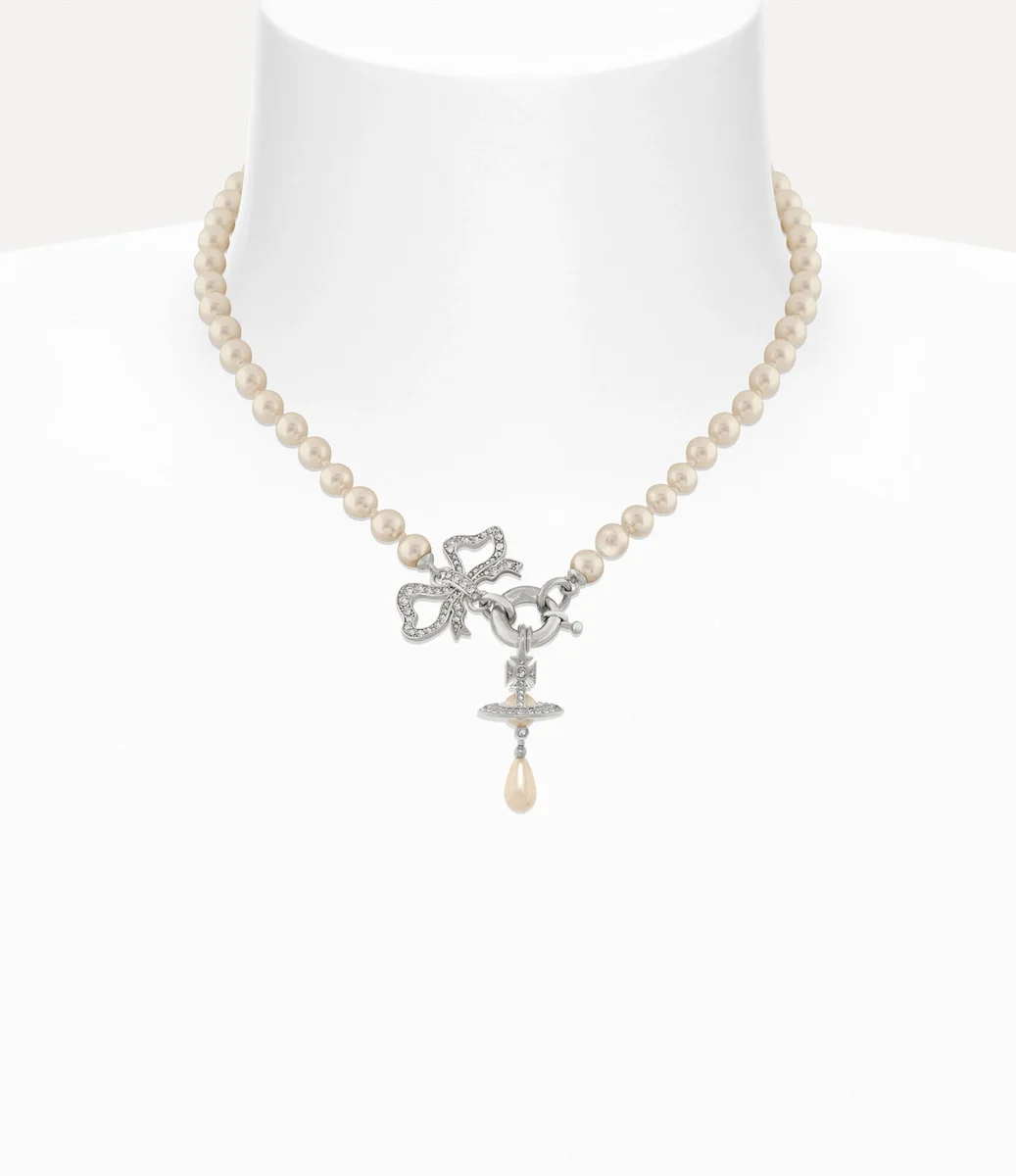 La collana Rigoberta Pearl, l’ultimo modello della linea Rigoberta, presenta una fila di perle di vetro Swarovski e un intricato ciondolo a forma di fiocco di ispirazione georgiana, elemento iconico della maison. Al centro, il motivo tridimensionale a forma di globo è evidenziato da un dettaglio a forma di perla a goccia, rifinito con una chiusura a molla.