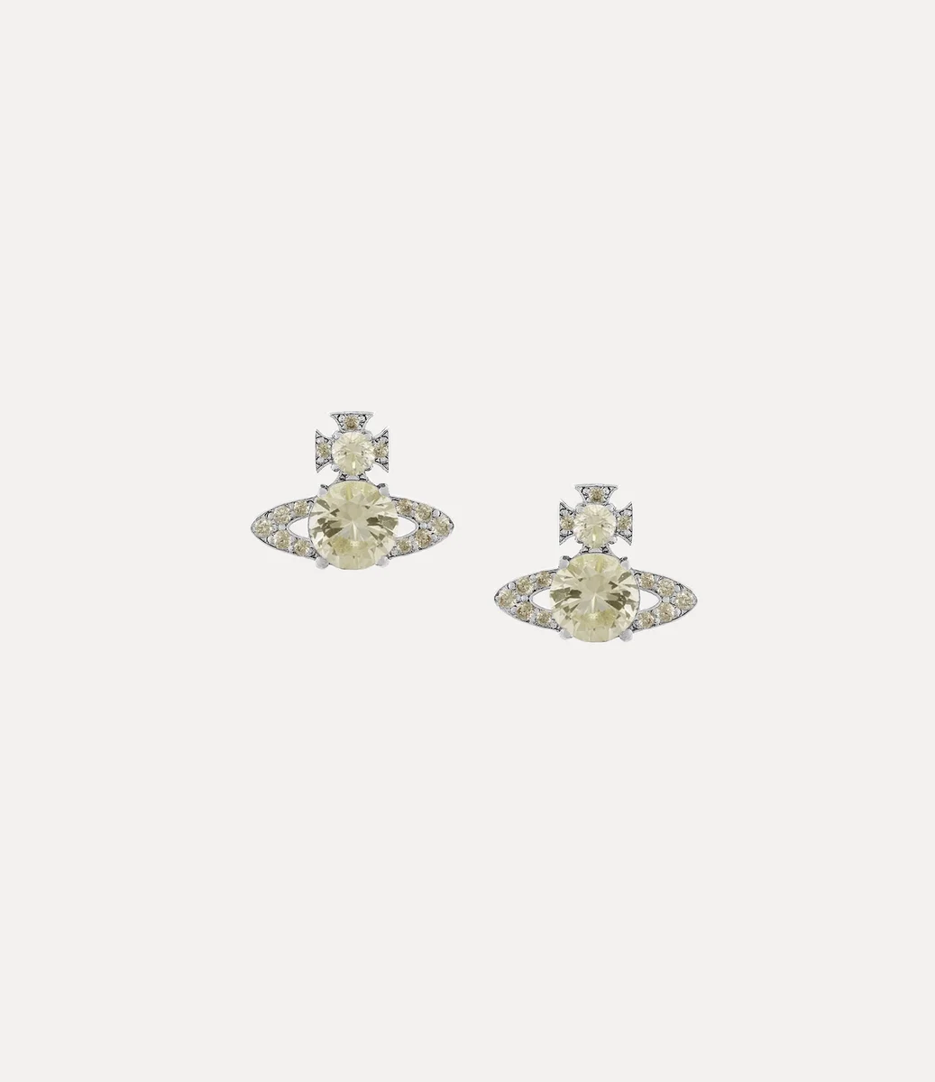 I nostri orecchini Ismene tornano in questa stagione, con una finitura lucida color argento e dettagli in cristallo giallo. La silhouette a sfera si ispira al motivo a sfera distintivo della maison, sinonimo della visione di Vivienne di lanciare la tradizione nel futuro.