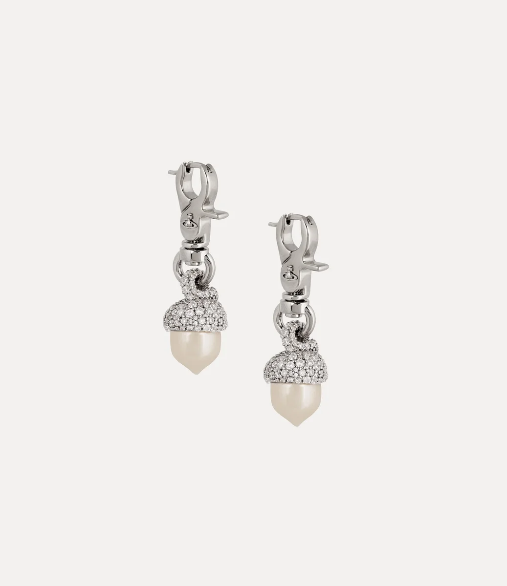 Gli orecchini Lucille Large presentano una chiusura girevole in stile hardware con un perno incernierato sicuro, caratterizzata dal tradizionale motivo a ghianda con una base rivestita di perle scintillanti e un cappuccio impreziosito da cristalli pavé. Il complesso marchio Orb inciso sulla chiusura completa il design, riecheggiando la visione di Vivienne di lanciare la tradizione nel futuro.
