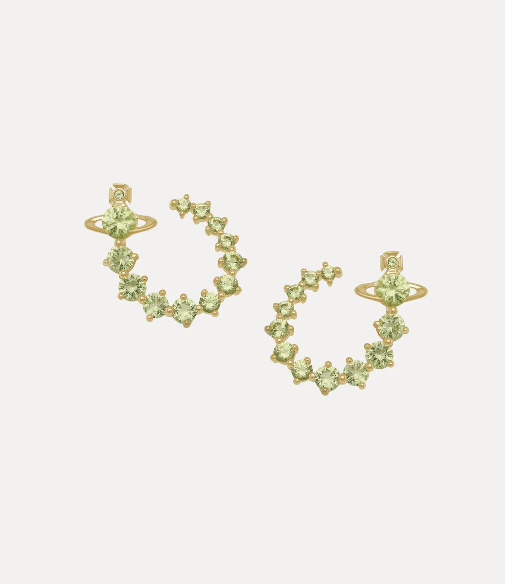 Realizzati in placcatura dorata lucida, i nostri orecchini Lydia si incurvano delicatamente attorno al lobo dell’orecchio creando l’illusione di un cerchio scultoreo. Impreziositi da pietre di zirconia cubica che si assottigliano elegantemente, il design è adornato dal nostro intramontabile emblema a forma di globo, che richiama la visione di Vivienne di portare la tradizione nel futuro.