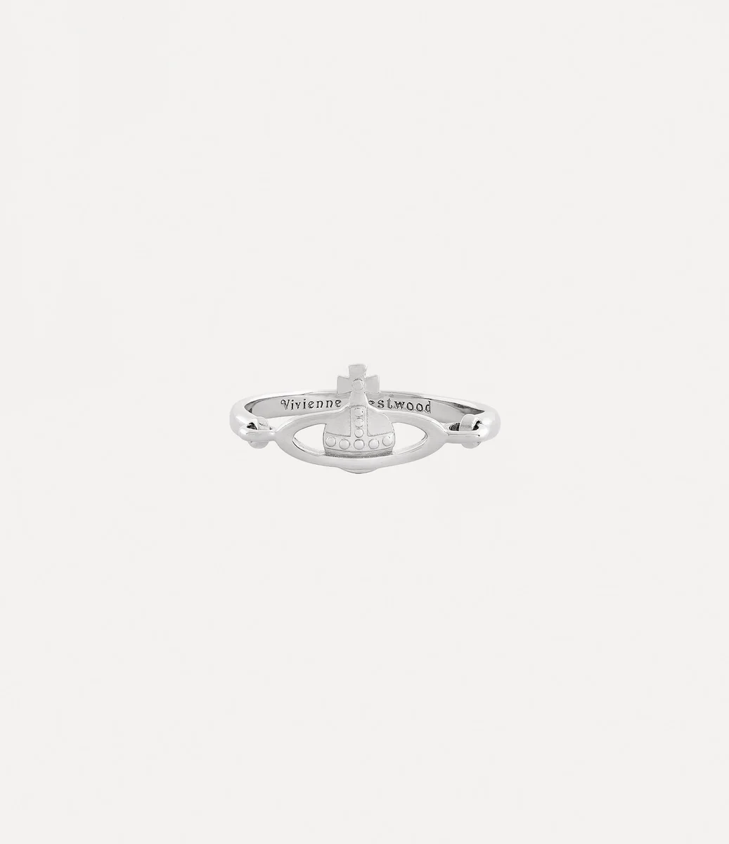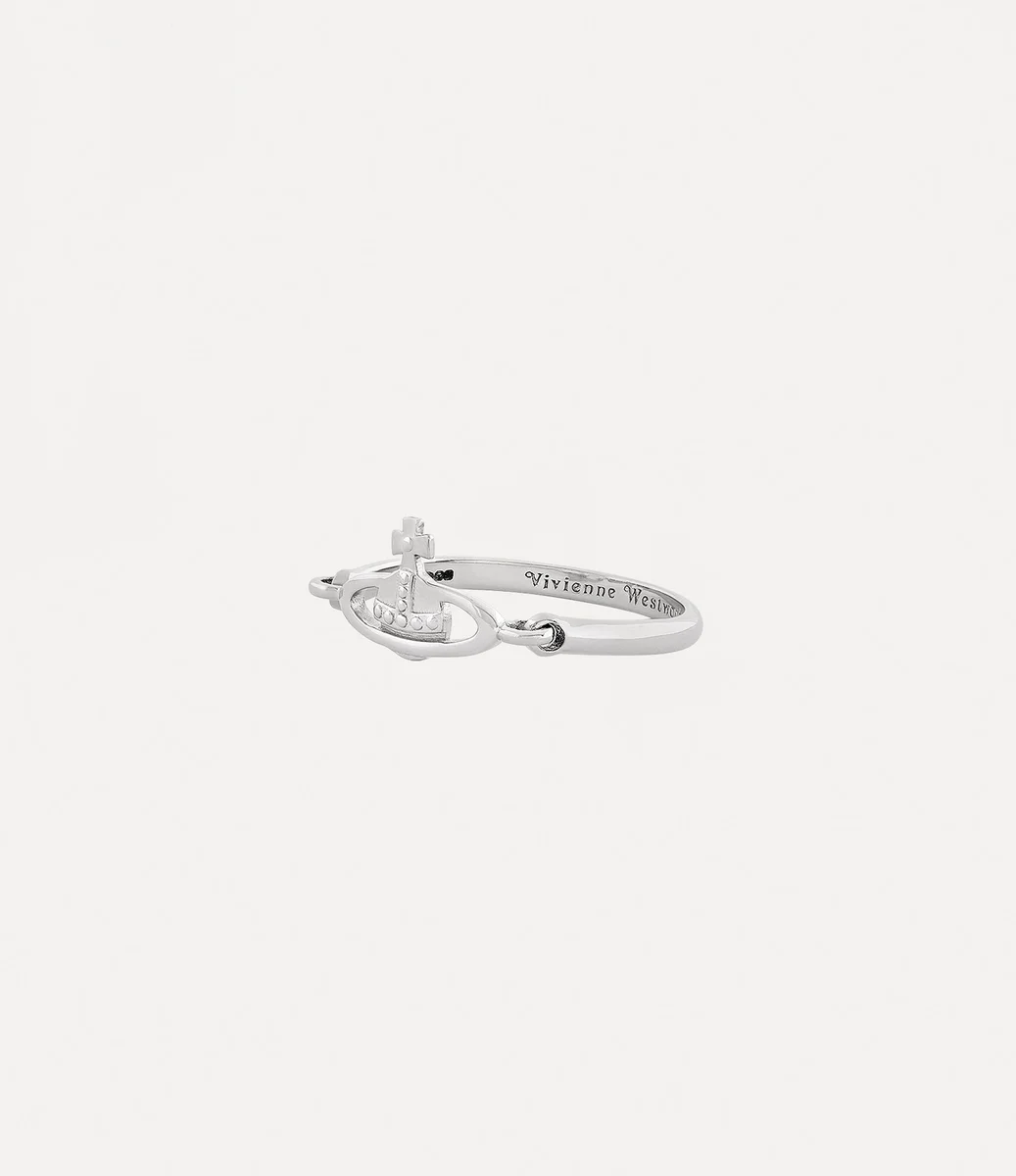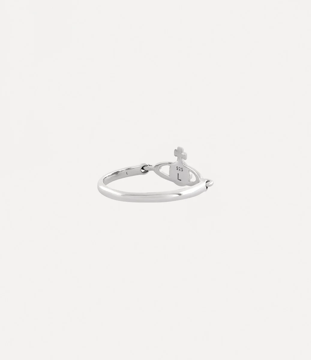 Il nostro anello Vendome in argento placcato platino presenta un delicato design a fasce, completato da un motivo a sfera ritagliato sulla parte frontale che può ruotare sui cardini, sinonimo della visione di Vivienne di portare la tradizione nel futuro. A completamento, il gioiello è inciso con il motivo tipografico distintivo della nostra maison sul lato interno.