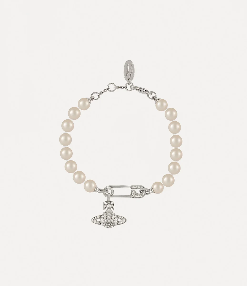 Le perle sono un elemento chiave dell’iconografia della maison, che rappresenta sia il lusso che la ribellione. Il bracciale Lucrece Pearl presenta un filo di perle in vetro, impreziosito da una sfera incastonata di cristalli che pende da un ciondolo a forma di spilla da balia. Questo intramontabile motivo a spilla da balia simboleggia l’anticonformismo, riflettendo l’approccio punk che contraddistingue Vivienne.