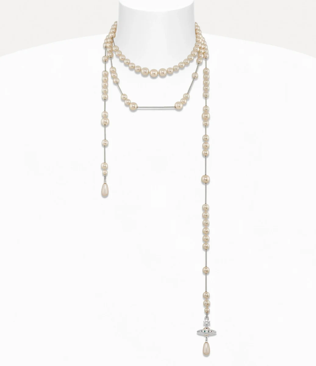 Le perle sono un elemento essenziale dell’iconografia della maison, evocando un senso di grandiosità e lusso. La collana Broken Pearl è stata presentata per la prima volta nella collezione “Storm in a Teacup” dell’autunno-inverno 1996-97, ispirata agli schemi decorativi dell’arte rococò. Questo gioiello è caratterizzato da perle di vetro, con gli elementi “Broken” tipici di Vivienne, progettato per le donne che “affrontano l’orrore dell’uniformità e del minimalismo”.