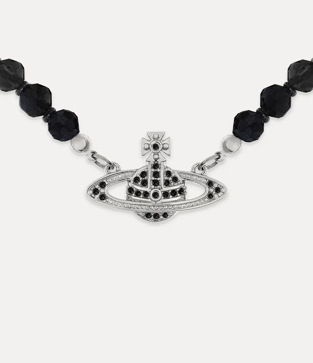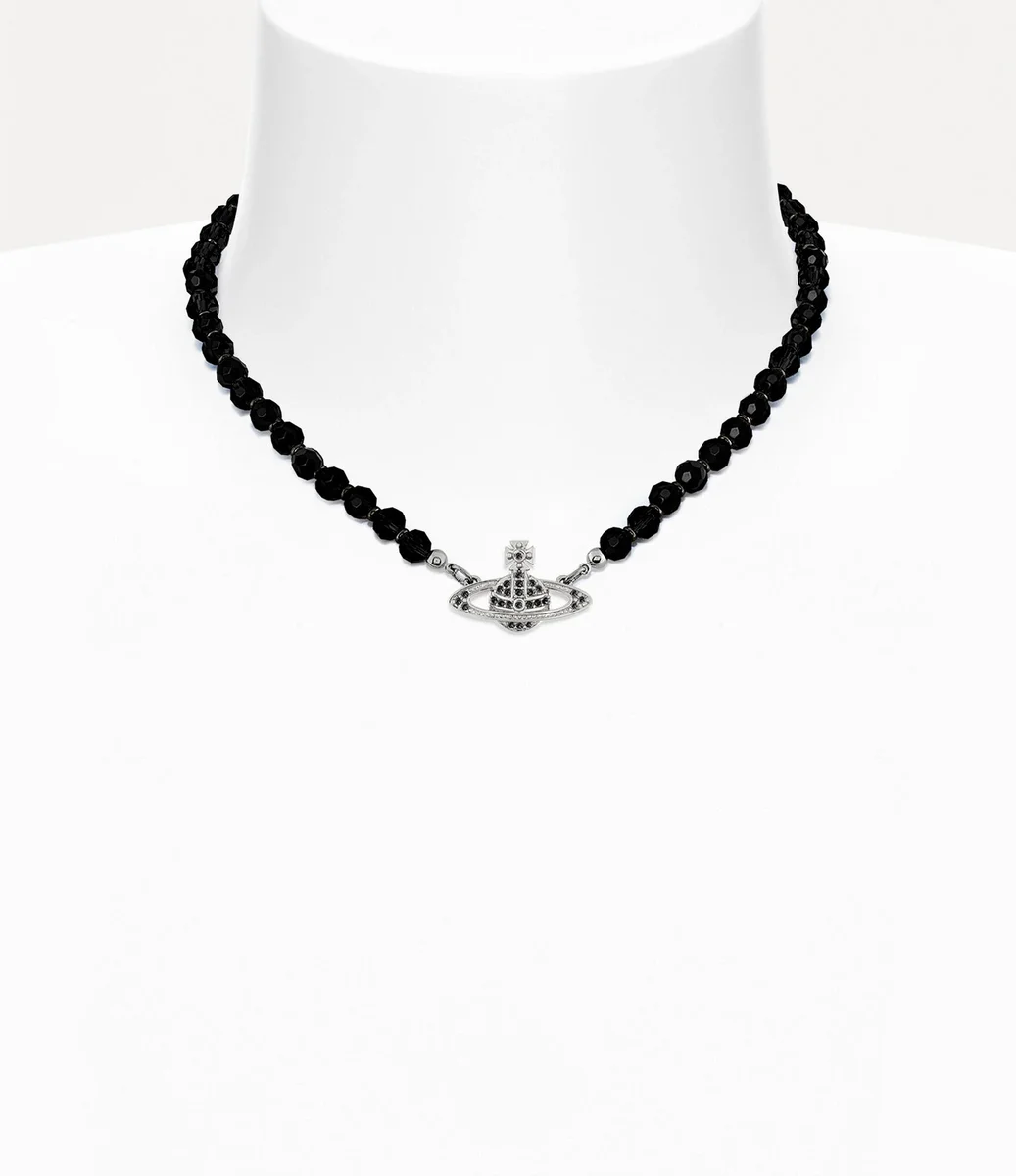 Il nostro girocollo Messaline è stato ripensato con cristalli di agata nera annodati a mano, ciascuno con una finitura finemente intagliata. Questo audace gioiello presenta il nostro caratteristico pendente a forma di globo, impreziosito da cristalli nero corvino e placcatura color argento, che incarna la visione di Vivienne di proiettare la tradizione nel futuro.