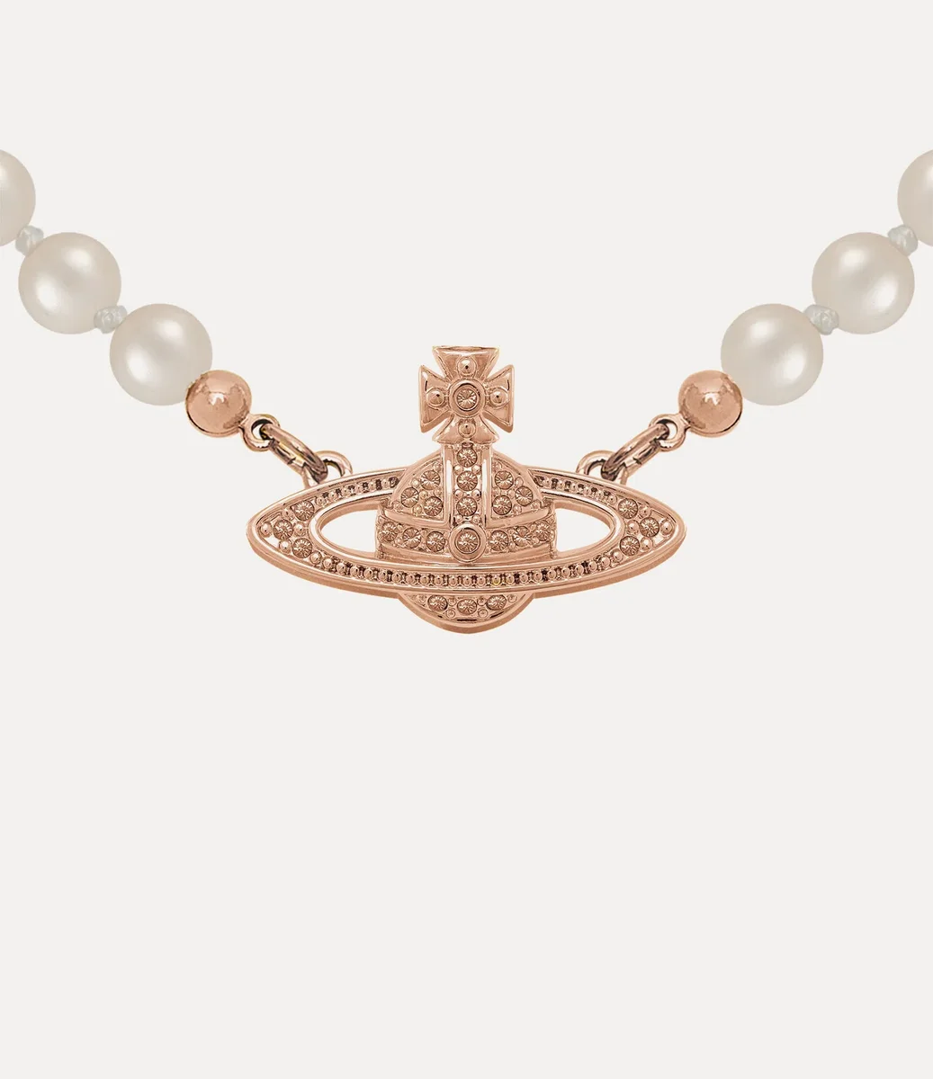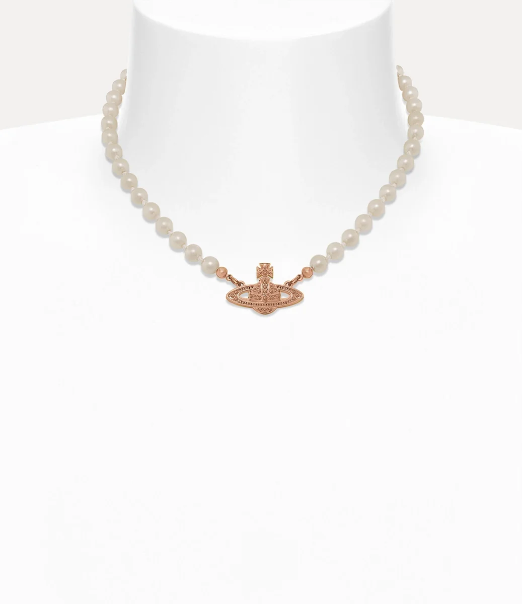 Il girocollo Mini Bas Relief Pearl di Vivienne Westwood presenta dettagli in perle, completati dal motivo a sfera, simbolo della maison, al centro del design.