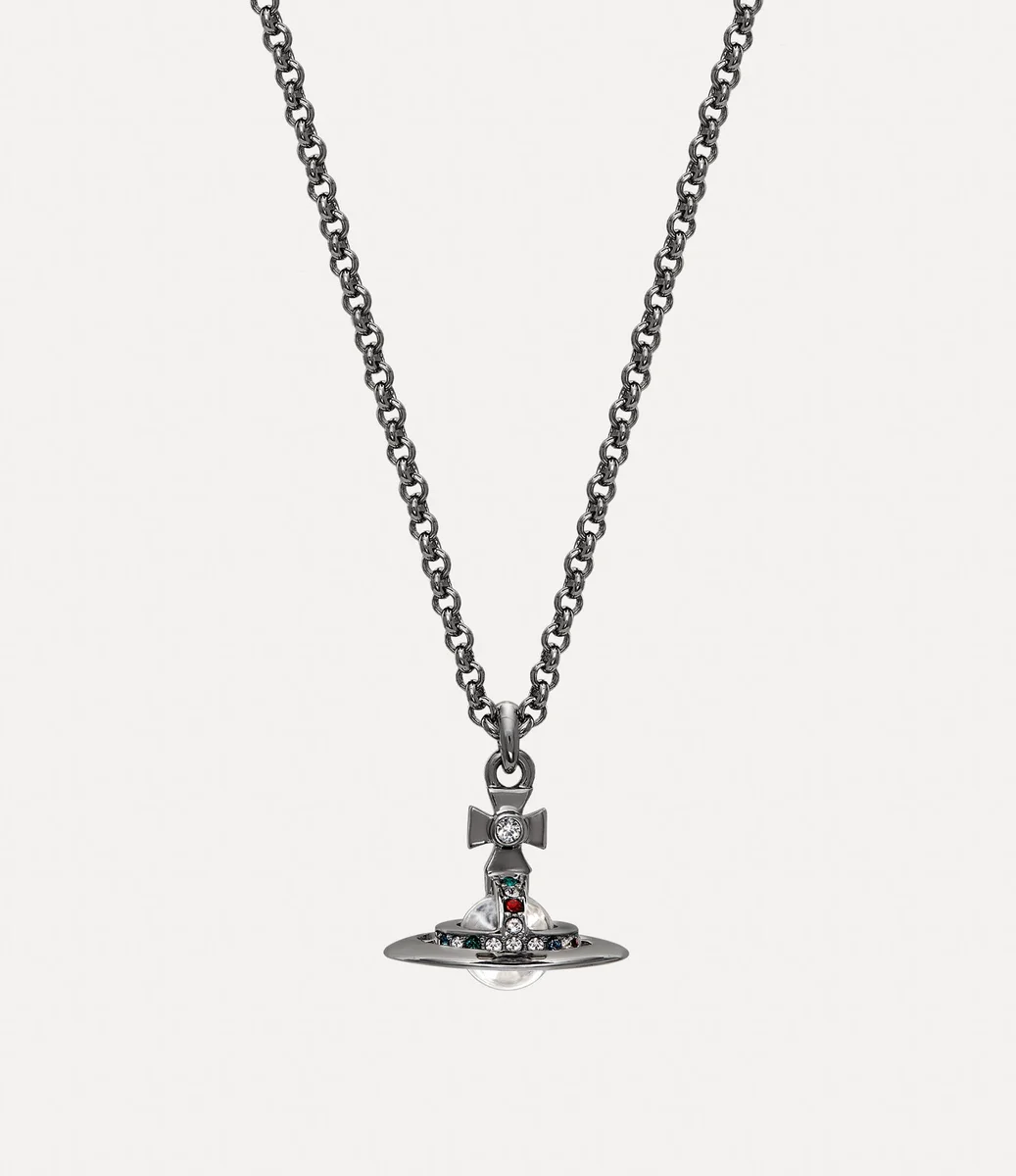 La nostra collana New Petite Orb Pendant è stata aggiornata in questa stagione con una placcatura color canna di fucile. Incrostata con dettagli scintillanti in cristallo rosso, smeraldo e bianco, il design incorpora la nostra caratteristica sfera tridimensionale al centro della catena, sinonimo della visione di Vivienne di lanciare la tradizione nel futuro.