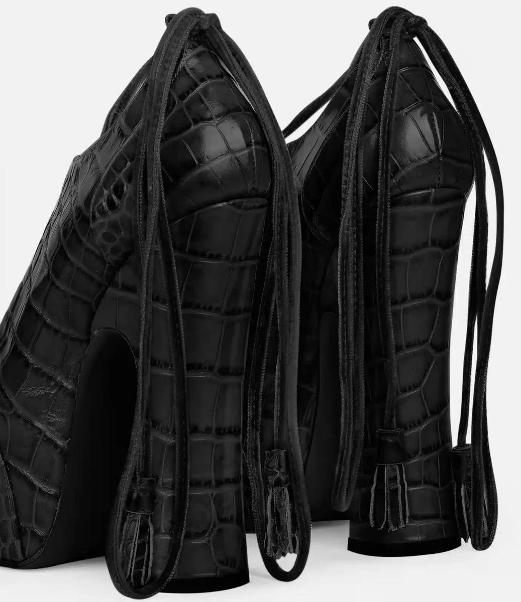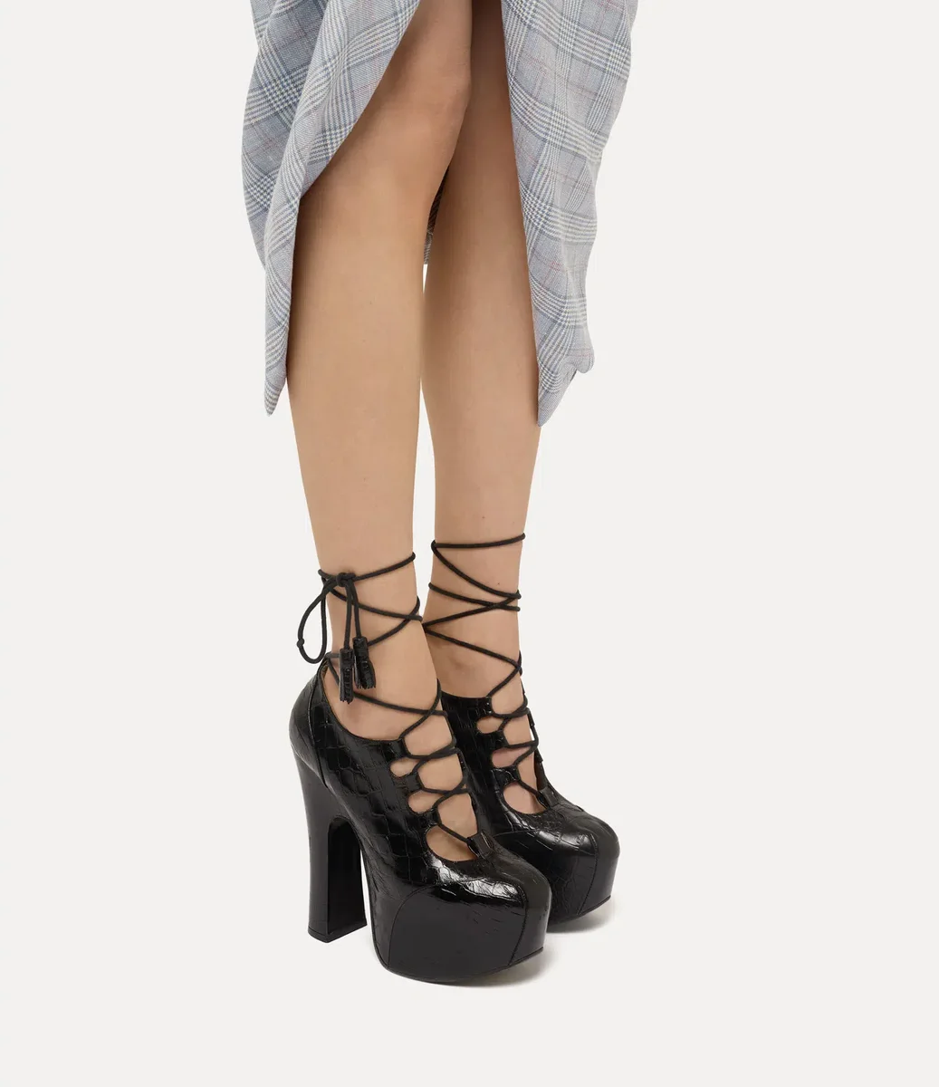 Ispirate agli abiti cerimoniali delle Highlands scozzesi, le nostre scarpe con plateau Elevated Ghille reinterpretano le classiche ghillie brogue, con un motivo goffrato effetto coccodrillo su tutto il design. Il modello presenta una punta corta e arrotondata con caratteristici dettagli cut-out, completata da lunghi lacci con nappine che avvolgono la caviglia.