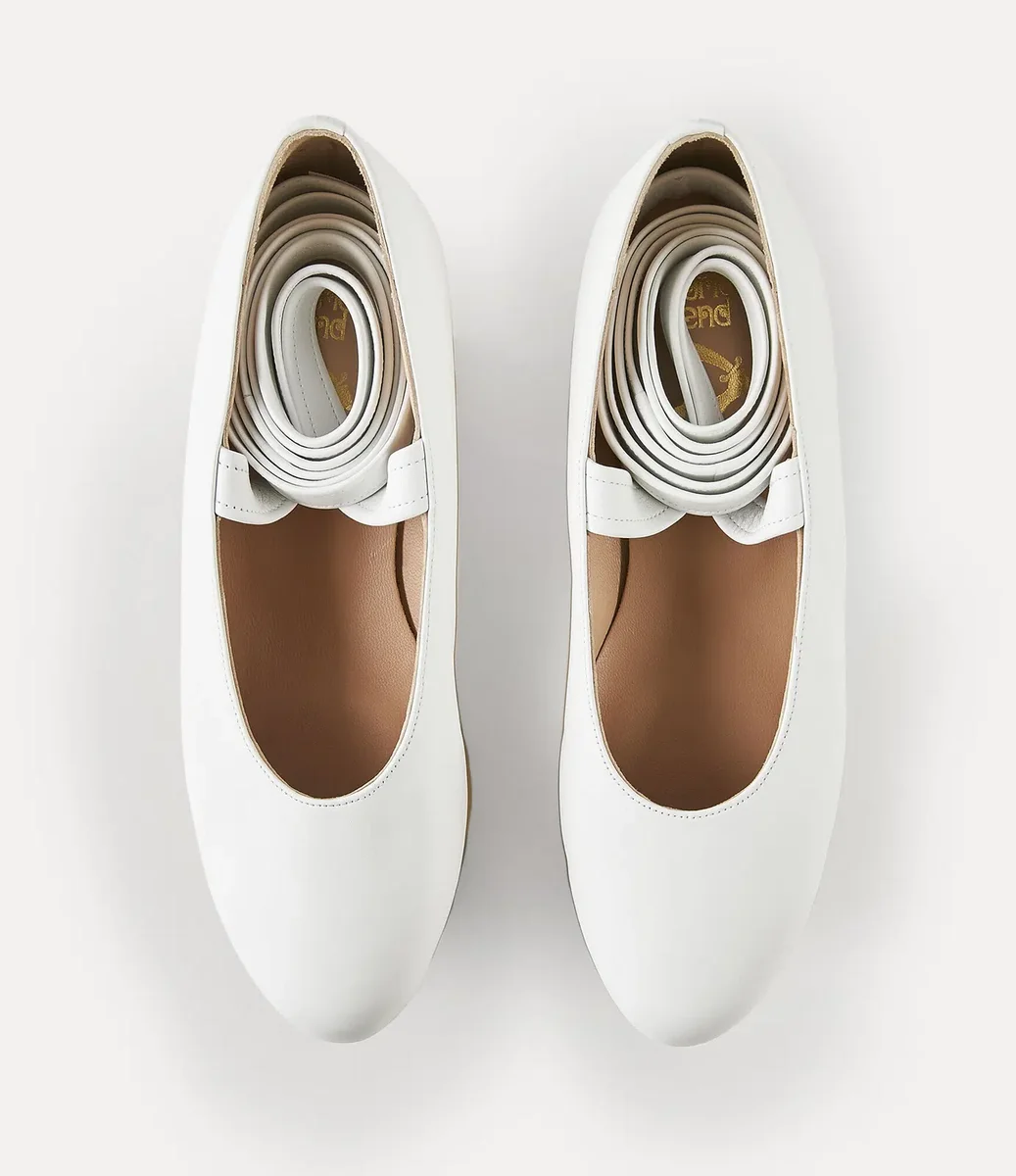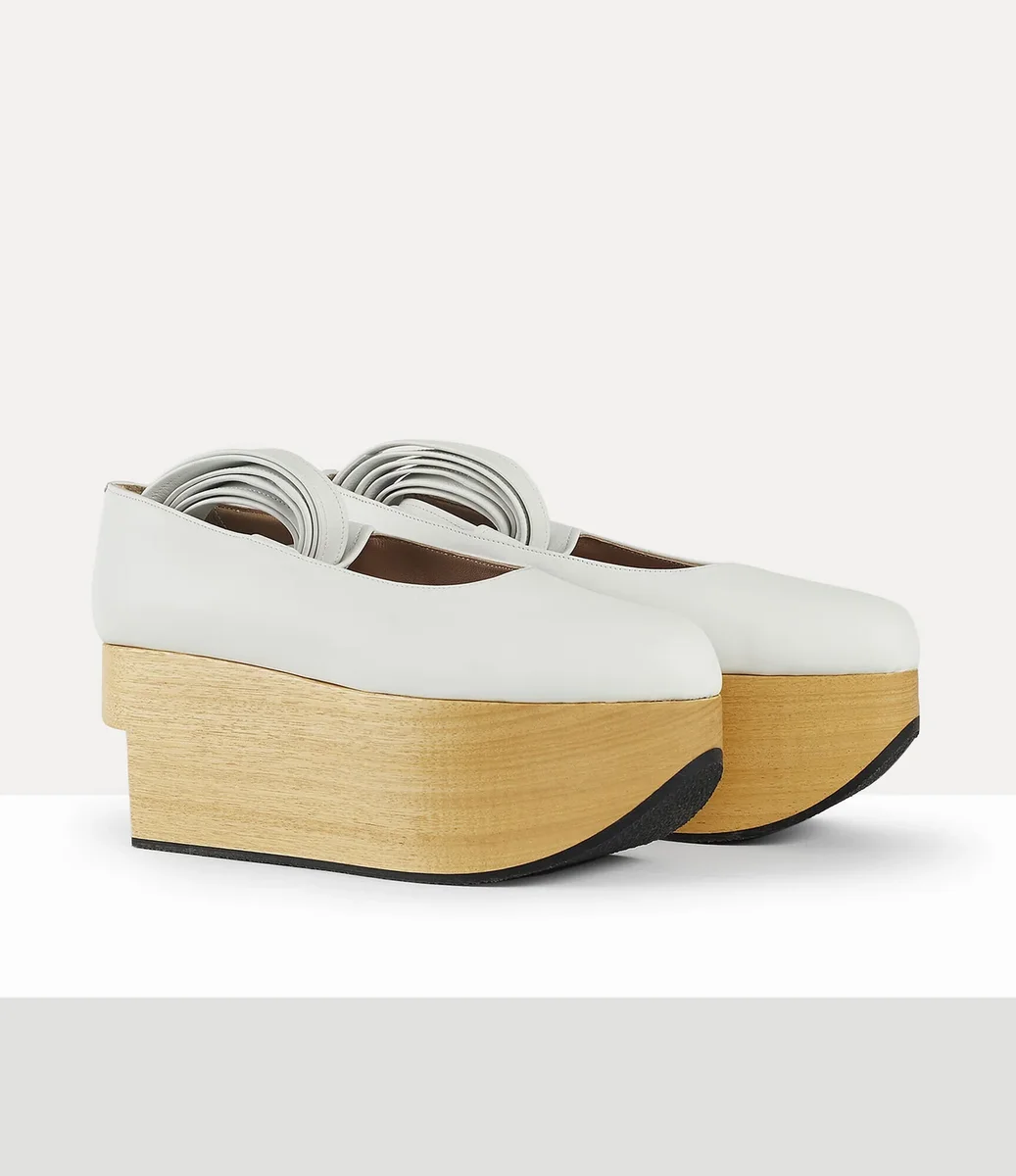Le nostre ballerine Rocking Horse sono state presentate per la prima volta nella collezione Vivienne Westwood Autunno-Inverno ’87/88 “Harris Tweed”, progettate per garantire equilibrio e movimento. La punta arrotondata e i dettagli traforati nell’alta piattaforma in legno consentono a chi le indossa di dondolarsi in avanti mentre cammina, mentre i delicati nastri in pelle si ispirano alle scarpe da ballo classico.