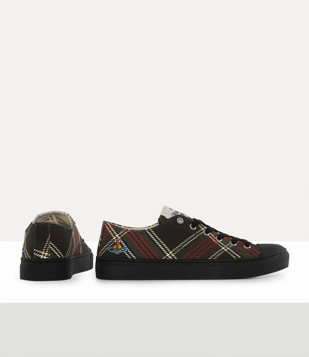 Le scarpe basse Plimsoll di Vivienne Westwood sono state rivisitate in questa stagione in tela di cotone stampata.